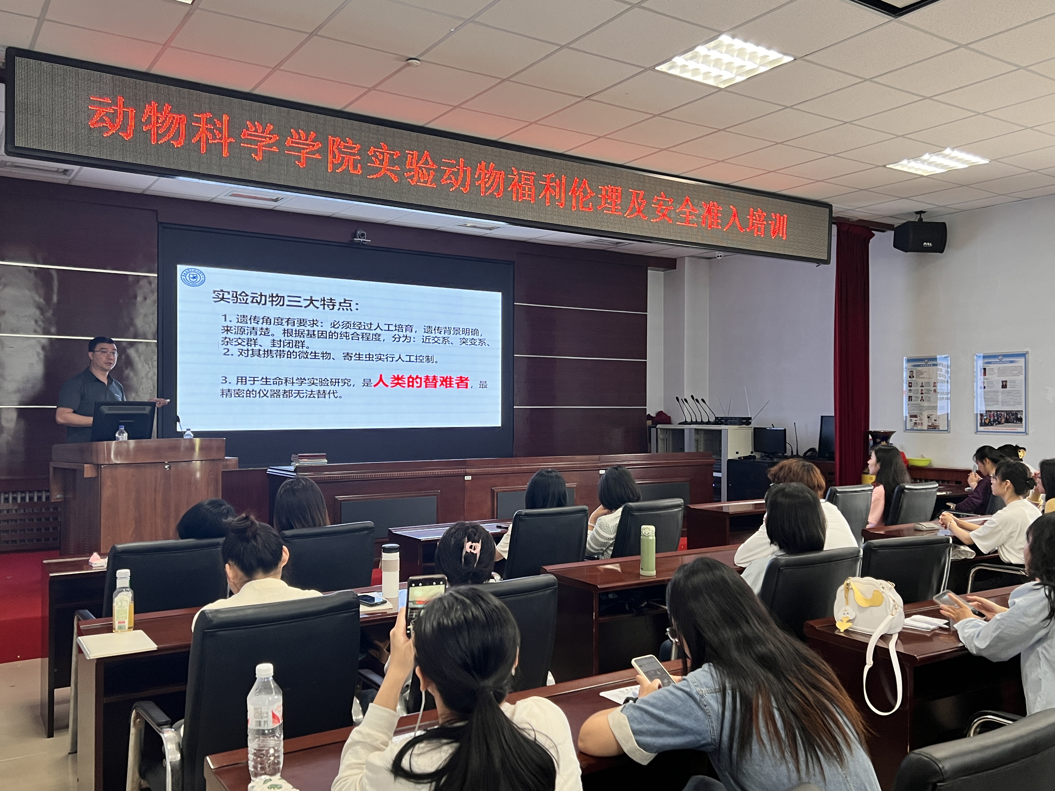 本次培训旨在确保研究生在未来的科研工作中能够坚守伦理标准,保障实验动物的福利,重视实验室安全。袁宝教授表示:“公司一直注重培养员工的伦理和安全意识,特别是在动物科学领域,这一点至关重要。通过这次培训,我们希望能够培养出既有扎实科研能力又具备高度伦理责任感的研究生。”袁宝教授向各位研究生介绍了国家的相关法律法规,与同学们分享个人心得体会并总结道:“我们期待着看到大家在未来的研究工作中取得卓越成就,同时也要强调,只有在严格遵守伦理和安全准则的前提下,科研成果才能得以合法合规产生。”