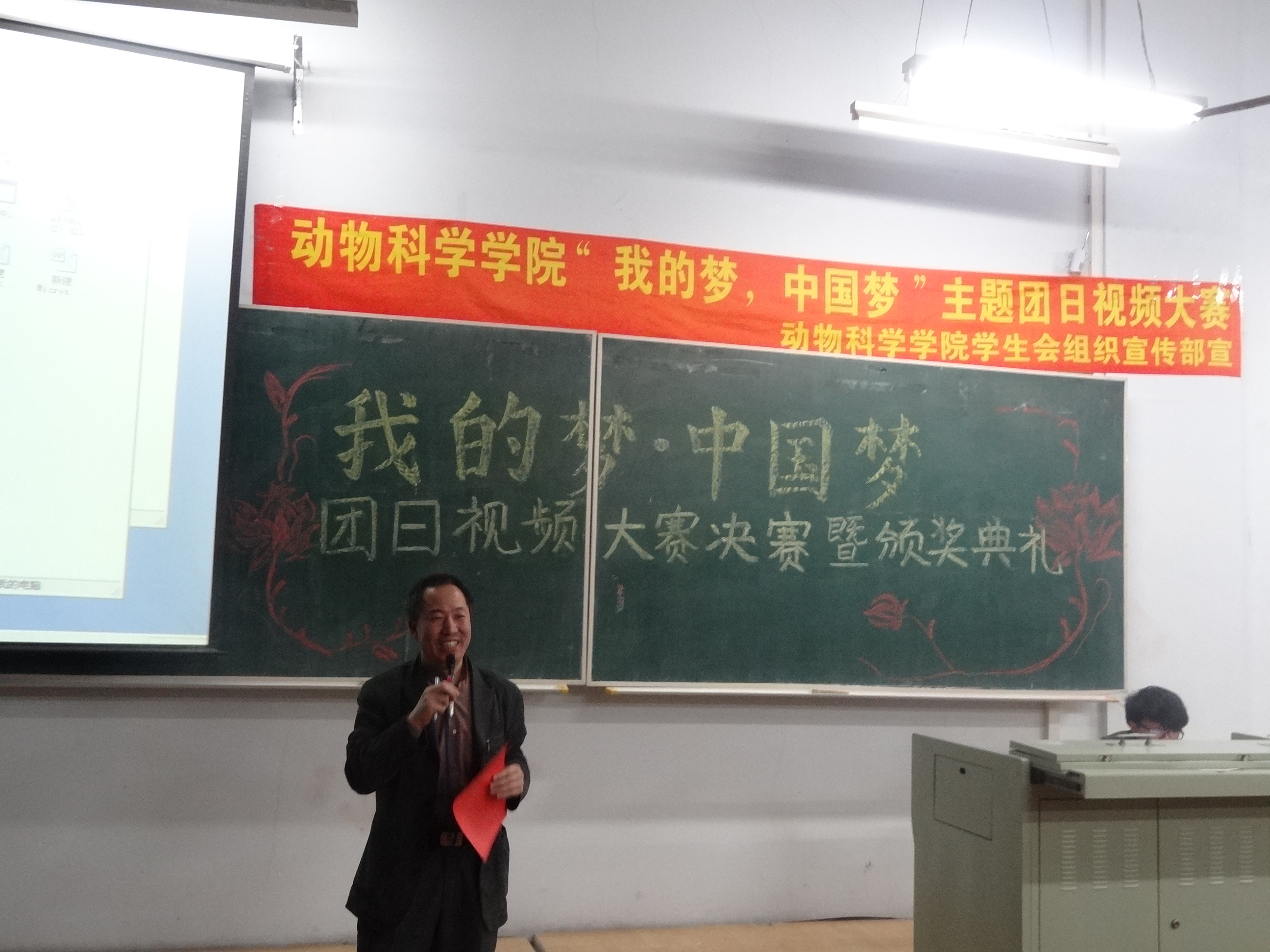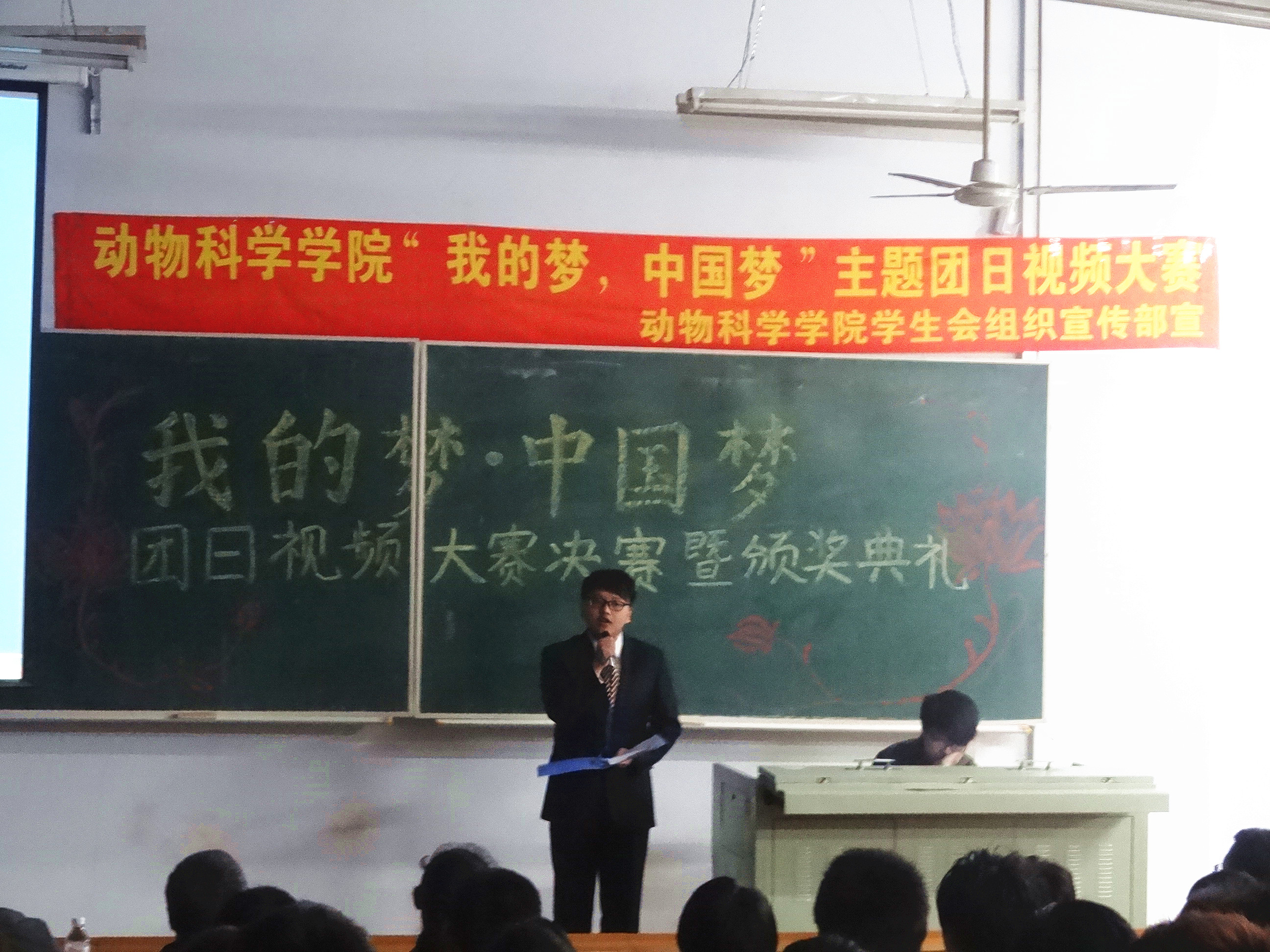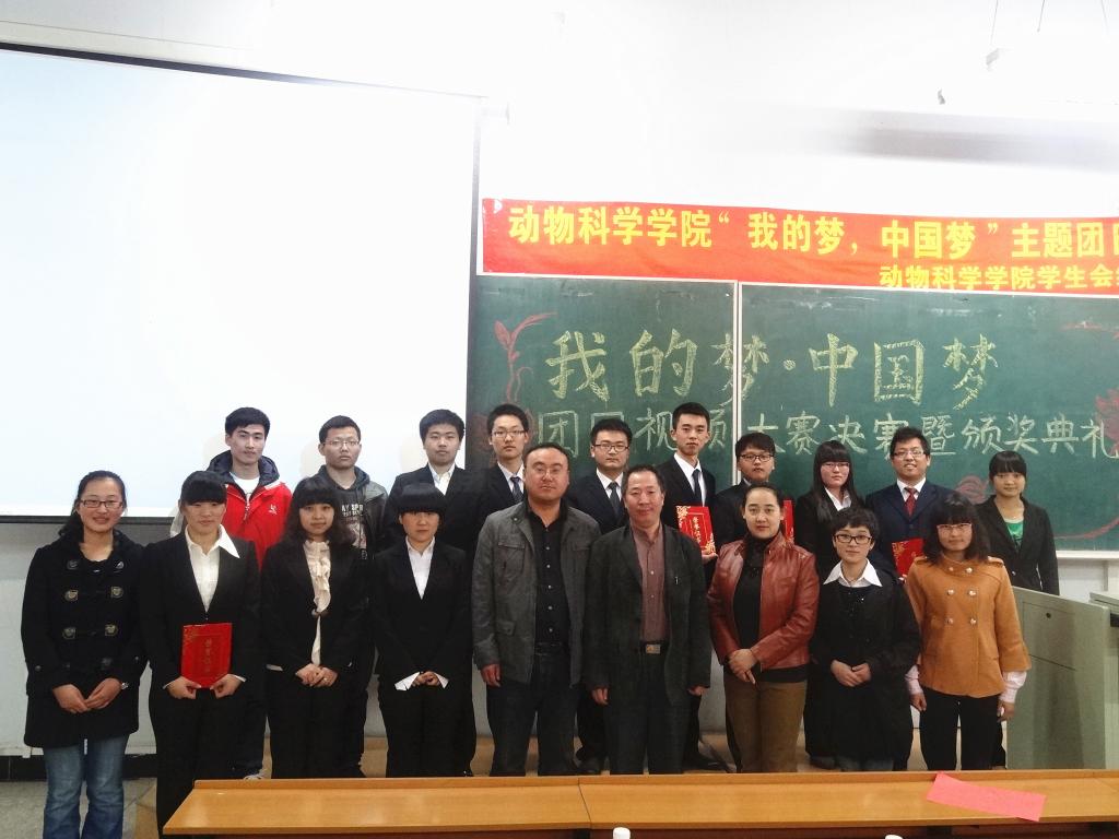 激情点燃梦想,智慧照亮夜空。2013年4月25日晚,乐天使“我的梦,中国梦”主题团日视频大赛决赛暨颁奖典礼在科学讲堂100教室拉开帷幕。莅临本次活动的嘉宾有动物科学公司党委副书记曹伟光老师,公司员工工作办公室主任兼团委书记于丹丹老师,2011级、2012级辅导员曾光老师以及公司第一届员工会主席团成员。