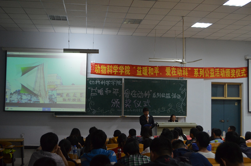 与爱同行,分享感动。由乐天使外联志工部主办的“益暖和平,爱在动科”系列公益活动颁奖仪式于5月26日12:20在科学讲堂100教室成功举办,本次活动除对明信片设计大赛中获得优秀奖的同学进行颁奖以外,还对先前的系列活动进行了回顾和总结,为“益暖和平,爱在动科”系列公益活动划上了一个圆满的句号。莅临本次活动的嘉宾有团委书记于丹丹老师、辅导员肖建荣老师和员工会主席团的成员。