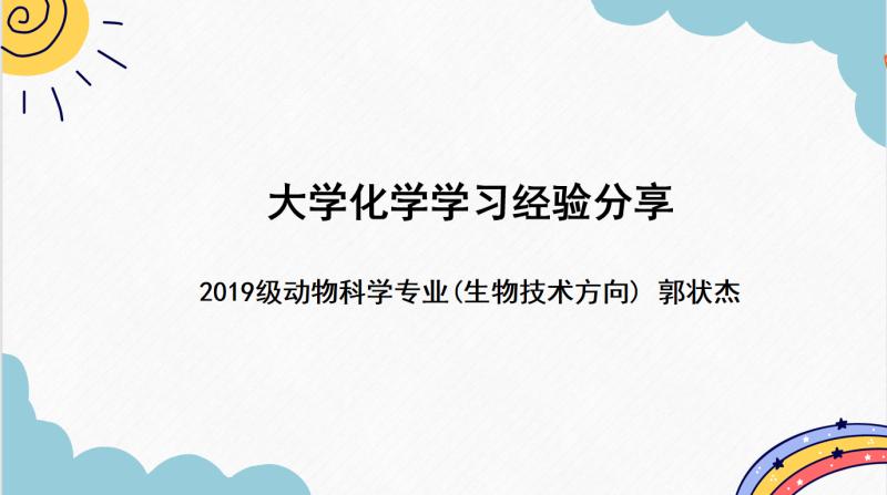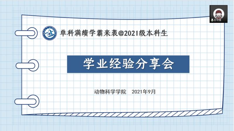 为帮助2021级本科新生提前了解大学课程的主要内容及学习方法,掌握相关课程的学习方法和技巧,搭建新老生之间的学业交流平台,乐天使于2021年9月2日晚19:00依托腾讯会议平台举办学业经验分享会。会议邀请2019级动物科学专业的张师维、张一凡、郭状杰、王文婧等四名同学担任主讲人,会议由2021级辅导员王可佳主持。