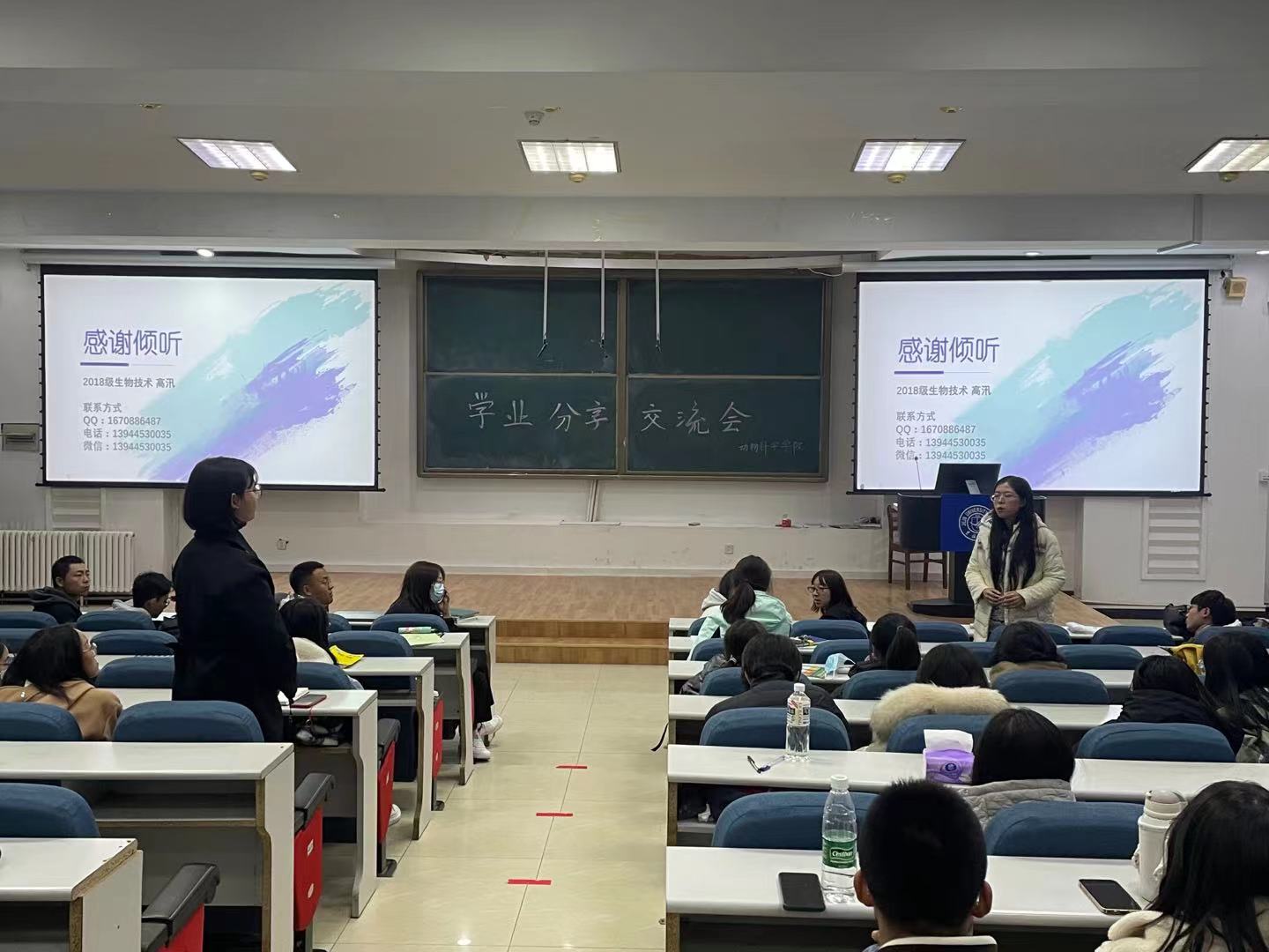 为帮助2021级新生及时了解大学学习方式与高中的不同,掌握更高效的学习方法和更直接的学习学习经验,乐天使于2021年10月17日晚18:30在中心校区经信楼F区第四阶梯教室举办了“保研学霸亲传学习秘籍”2021级本科生学业经验分享交流会。会议邀请了动物科学专业已保研的六名2018级本科生担任主讲人,会议由2021级新生辅导员王可佳主持,全体2021级本科生参加会议。