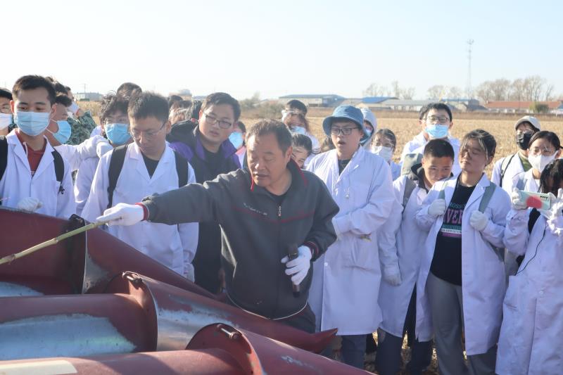 活动现场,农业实验基地副主任唐心龙老师结合玉米收获为同学们讲解了玉米联合收割机的各部分构造、功能,结合五桦犁耕整地作业讲解了农业整地作业模式、要求等,并组织员工观看机械作业。