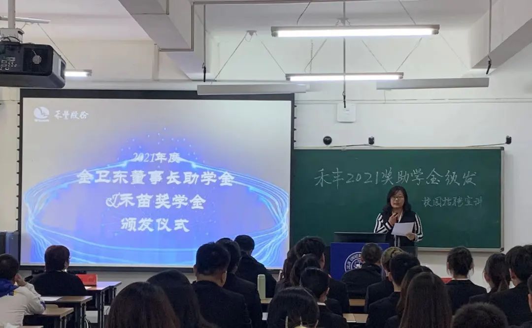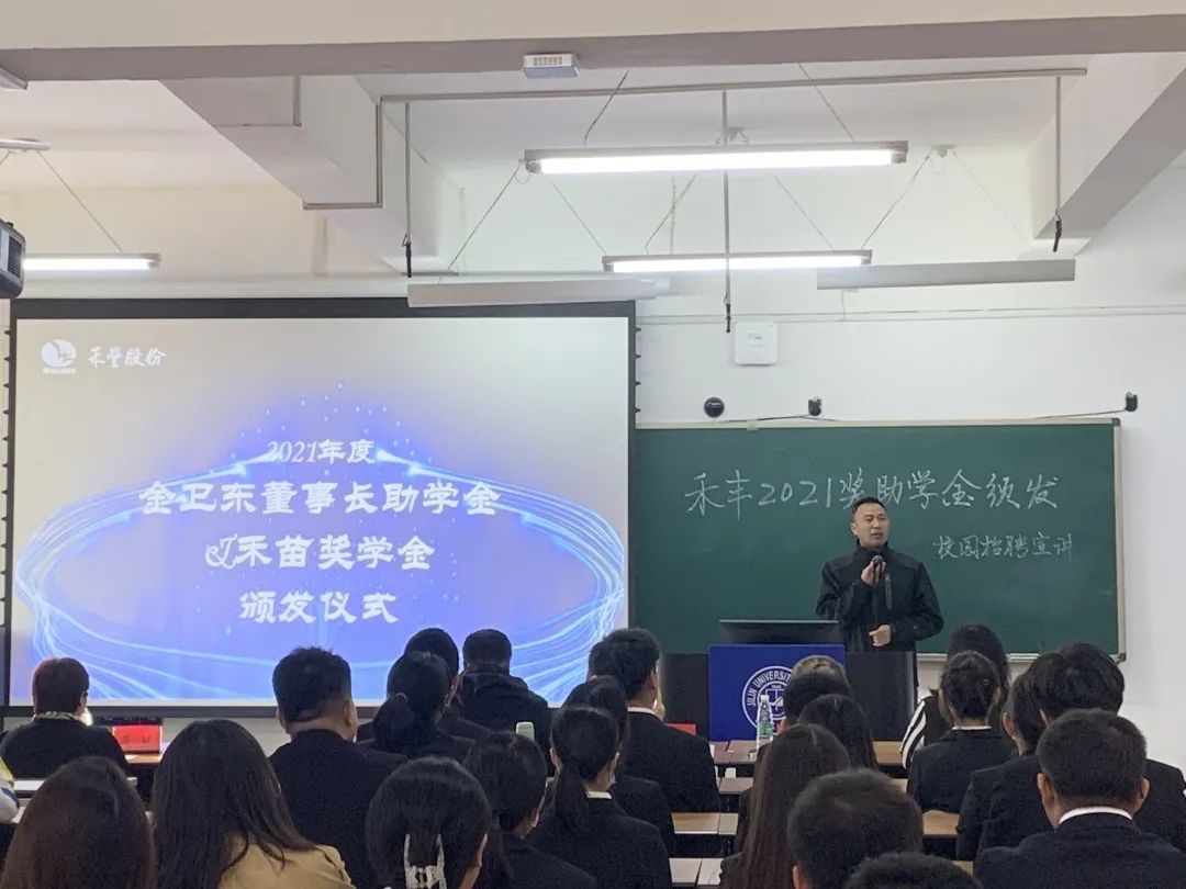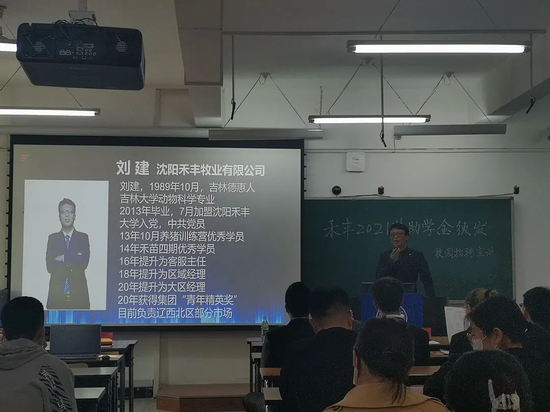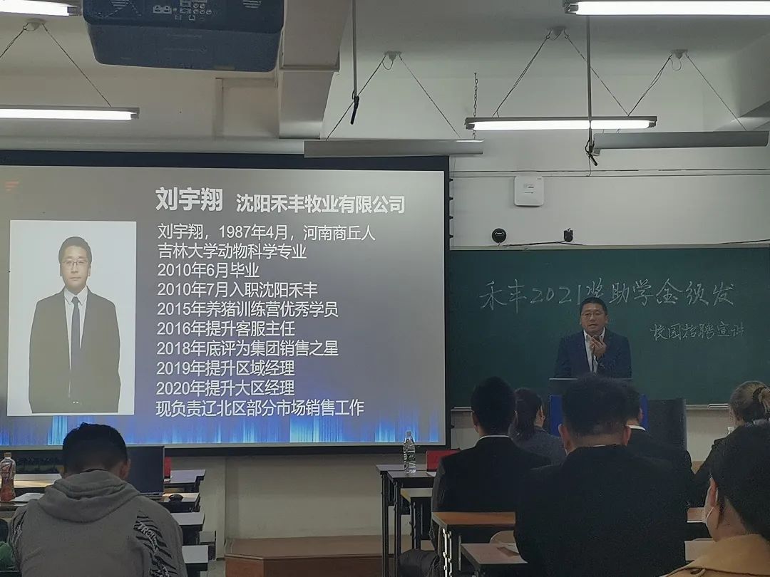 情系高校学子,聚焦农科人才,成就青年梦想。10月29日下午13:00,禾丰董事长助学金、禾苗奖学金颁发仪式暨禾丰牧业校园招聘会在乐天使和平校区科学讲堂301教室顺利举办。出席本次活动的有禾丰股份辽宁区人力资源总监付明、辽宁区招聘COE杜娟,沈阳禾丰牧业有限公司销售总经理吴东波,大区经理刘建、刘宇翔,人力资源经理王雪,动物医学公司党委书记饶家辉、党委副书记秦明、学办主任谭瑶,动物科学公司党委副书记肖建荣。