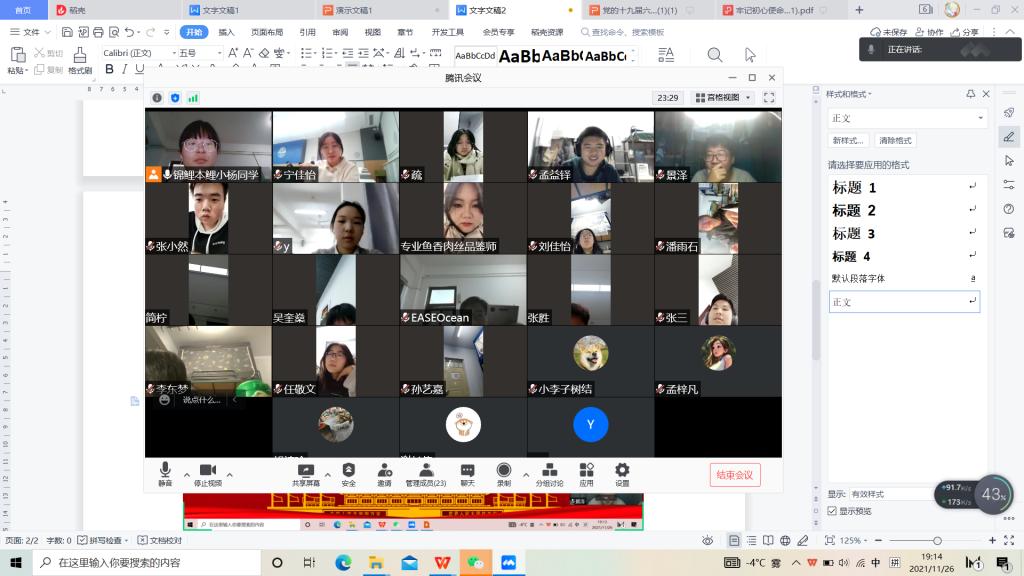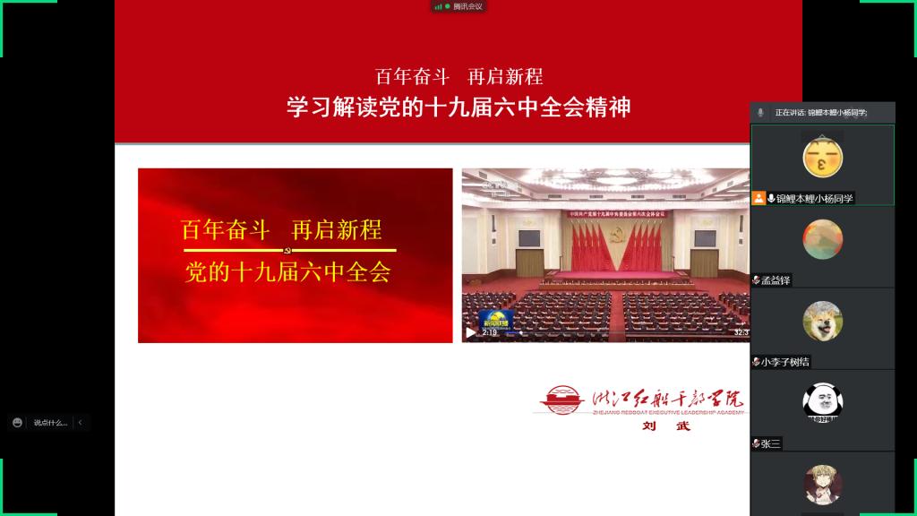 2021年11月8日至11日,中国共产党第十九届中央委员会第六次全体会议在北京胜利召开。全会是在党百年华诞的重大时刻、“两个一百年”奋斗目标历史交汇的关键时间节点召开,议题重大,成果丰硕。为深入学习贯彻习近平总书记重要讲话精神和党的十九届六中全会精神,乐天使2021级一班团支部于11月27日下午,通过线上会议开展主题团日活动,活动由团支部书记杨佩如主持。