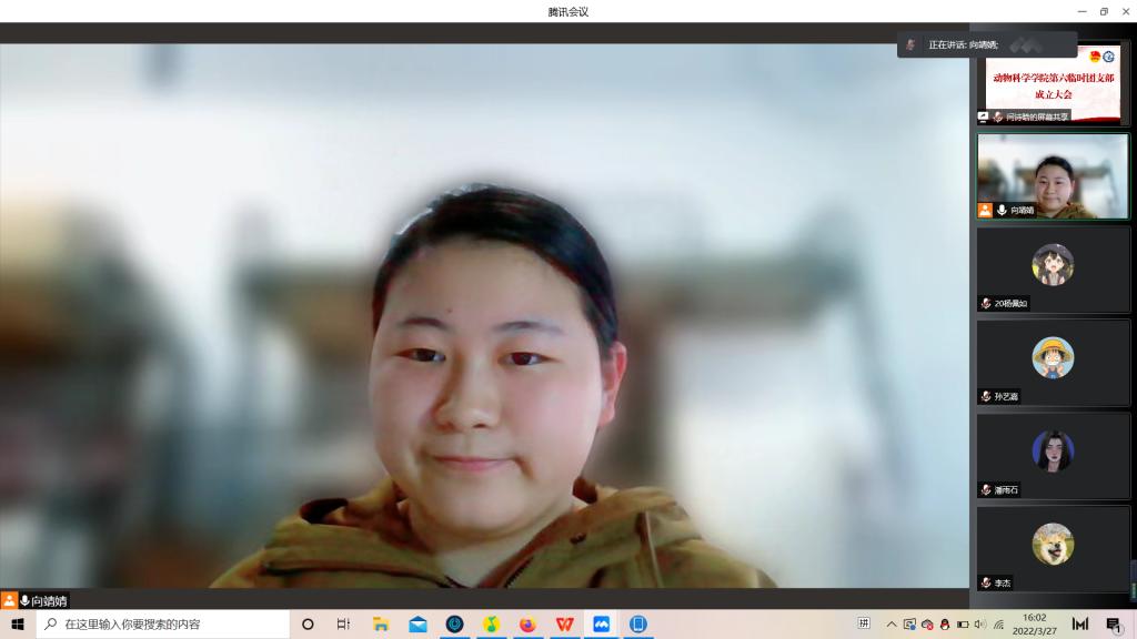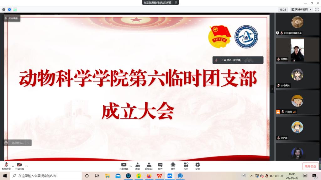 为积极响应校团委号召,强化团的基层建设,切实发挥共青团组织在防疫控疫工作中的战斗堡垒作用及团员的先锋模范作用,落实《关于疫情防控期间成立临时团支部的通知》的工作安排,公司第六临时团支部成立大会于3月29日下午四点由支部书记苏梦婷主持召开。支部全体成员即2018级、2019级实验动物班和2020级一班和平二公寓共34名同学参会。