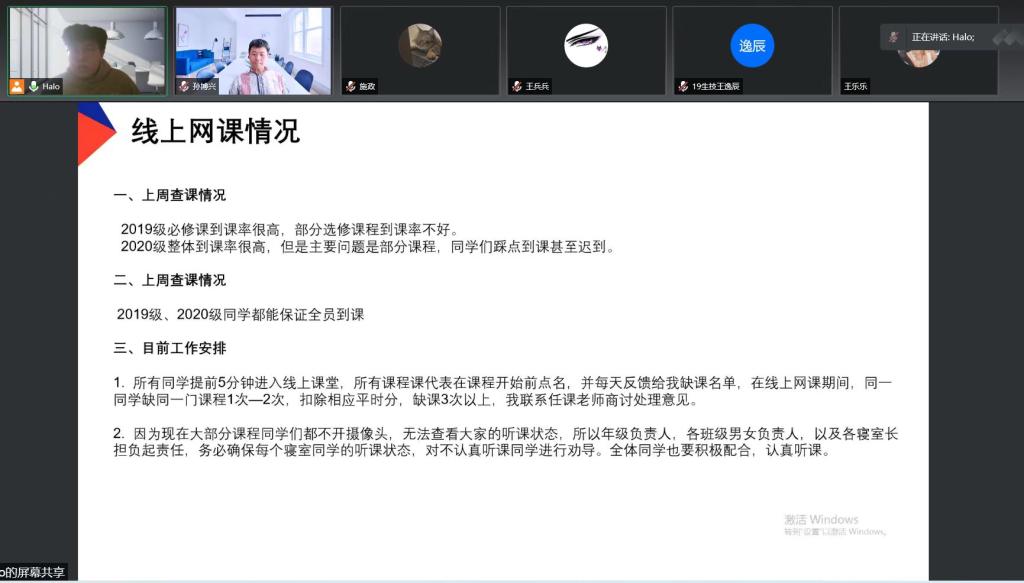 会议伊始,尹暄齐老师为同学们解读了公司发布的《全面落实清零攻关要求,严格员工提级管控工作》文件精神,他表示:在抗疫的关键时期,同学们一定要严格遵守疫情管控工作细则,落实落细清零攻关任务要求,继续坚持配合属地、公司防疫工作,为争取早日解封打下基础。紧接着,尹暄齐老师向同学们解读了公司最新发布的关于网上订餐的通知,带领同学们认真学习线上订餐流程并提醒同学们注意订餐时间,保证健康的饮食生活习惯。随后,针对隔离期间同学们的网课学习情况,尹暄齐老师通报了上周的查课情况并指出,2019级、2020级同学虽然能保证全员到课,但有踩点、迟到的情况出现,他希望同学们能做到上课提前5分钟进入线上课堂,室友之间互相帮助、互相提醒、共同进步,保持积极的学习态度和良好的学习状态。最后,尹暄齐老师叮嘱同学们在静态封控的生活状态下要注重用电安全和寝室卫生,及时整改安全隐患。