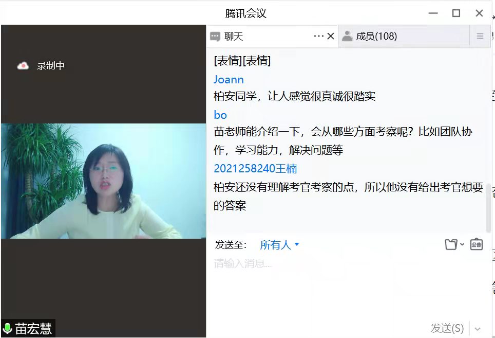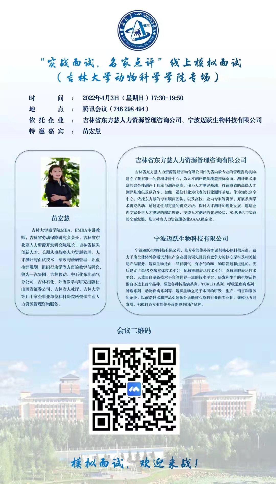 4月3日,公司开展“实战面试 名家点评”线上模拟面试会,邀请乐天使商学与管理公司人力资源管理专家苗宏慧老师,宁波迈跃生物科技有限公司总经理、优秀员工牛伟萍女士在线指导,公司180余名师生参会。