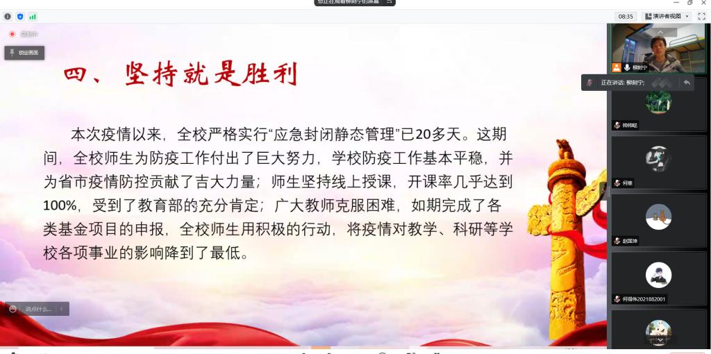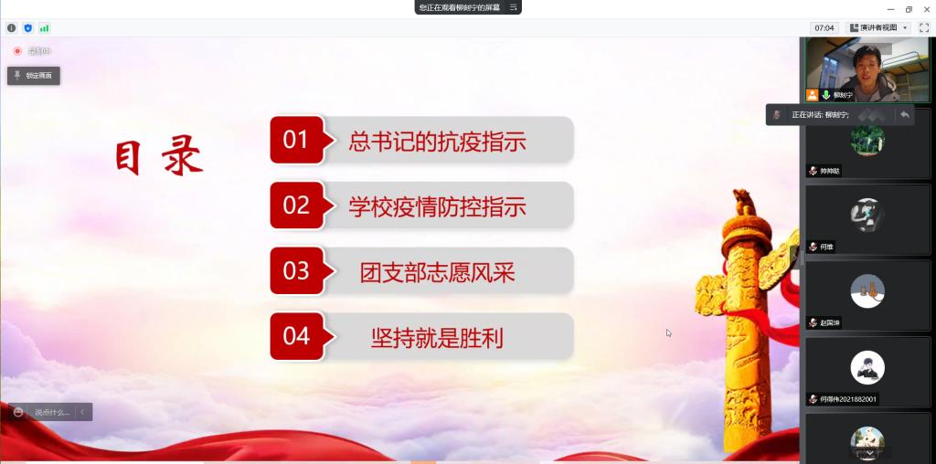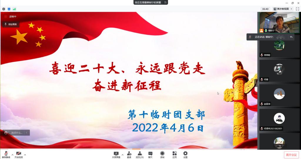 为学习贯彻习近平总书记关于疫情防控工作的重要指示精神、认真学习各级党委和政府的疫情防控工作部署,教育广大团员青年遵守疫情防控要求,执行公司、公司疫情防控工作各项规定,保证每日作息健康规律,保证充足学习时间。公司第十临时团支部于4月6日晚6时召开“喜迎二十大,永远跟党走,奋进新征程”为主题的团日活动。此次会议采取线上腾讯会议的形式举行,第十临时团支部全体团员参与了此次活动。会议由团支部副书记任中帅主持。