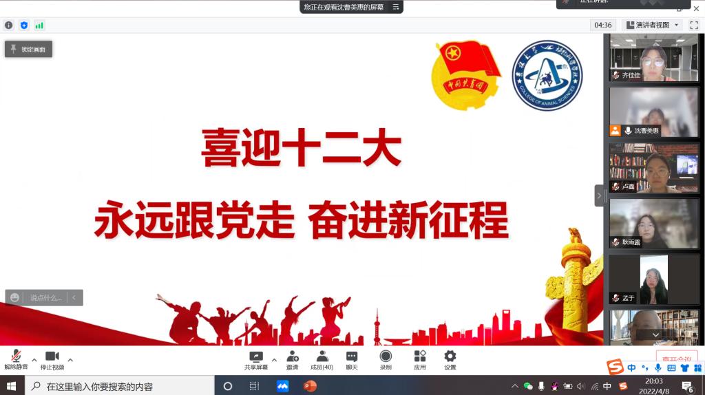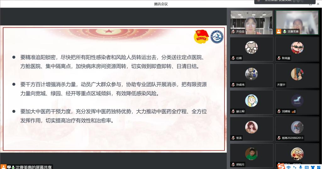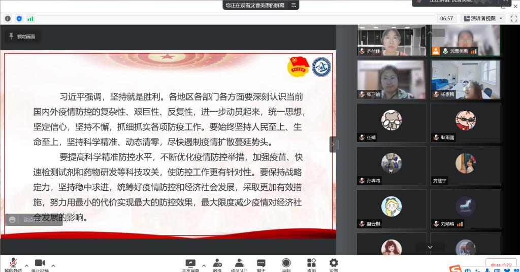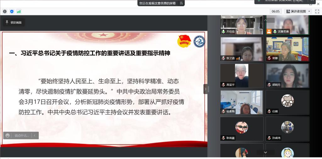 2022年初,一场突如其来的疫情打乱了原本的校园生活秩序。在全面封控的形势下,为坚定共青团员万众一心、共同抗“疫”的理想信念,培养爱党爱团的家国情怀,学习贯彻习近平总书记关于疫情防控工作的重要讲话精神,公司第十一临时团支部于4月8日晚20点开展“喜迎十二大,永远跟党走,奋进新征程”为主题团日活动。本次团课活动借助腾讯会议,以线上形式开展,会议由团支书沈曹美惠主持,支部全体成员参加。