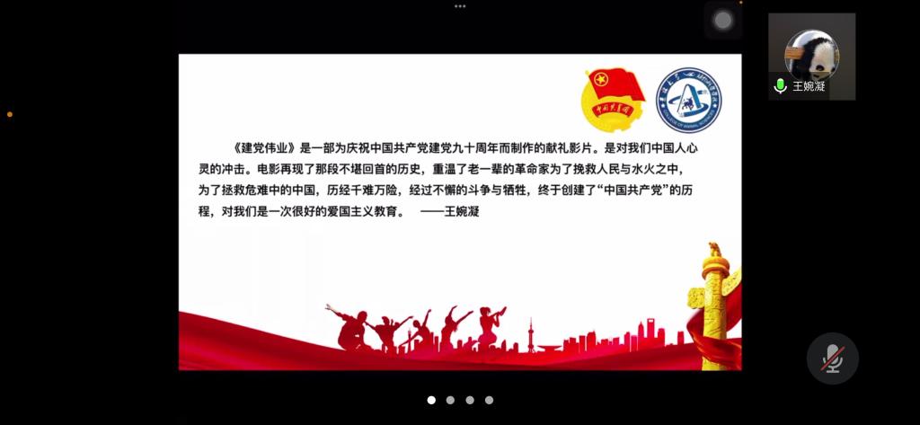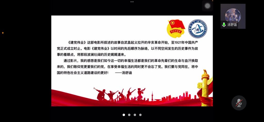 王婉凝同学表示,“此次观影,我从伟大建党精神中汲取精神营养,也让我想到建党90年后的今天,同样有许多党员如老一辈党员一样,为国家奋不顾身,坚守在抗“疫”最前线,而我作为新时代团员也应为疫情的控制贡献自己的一份小小力量。”