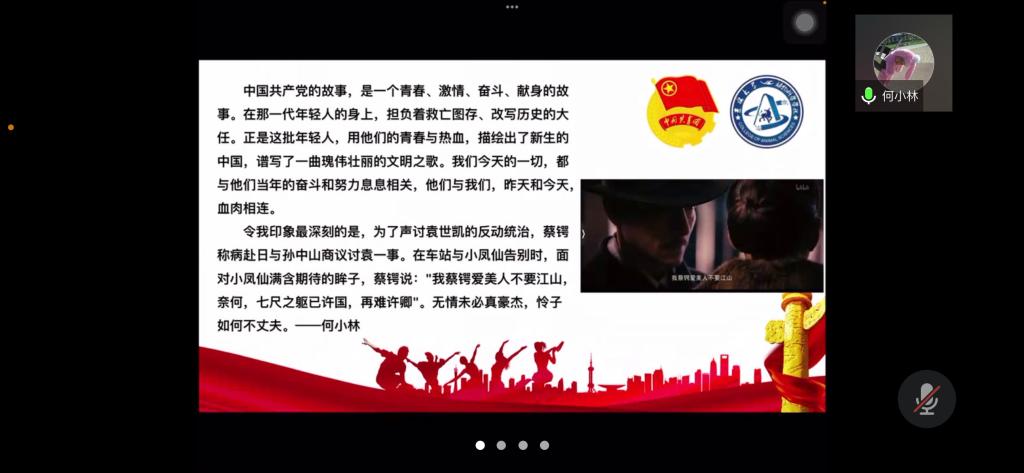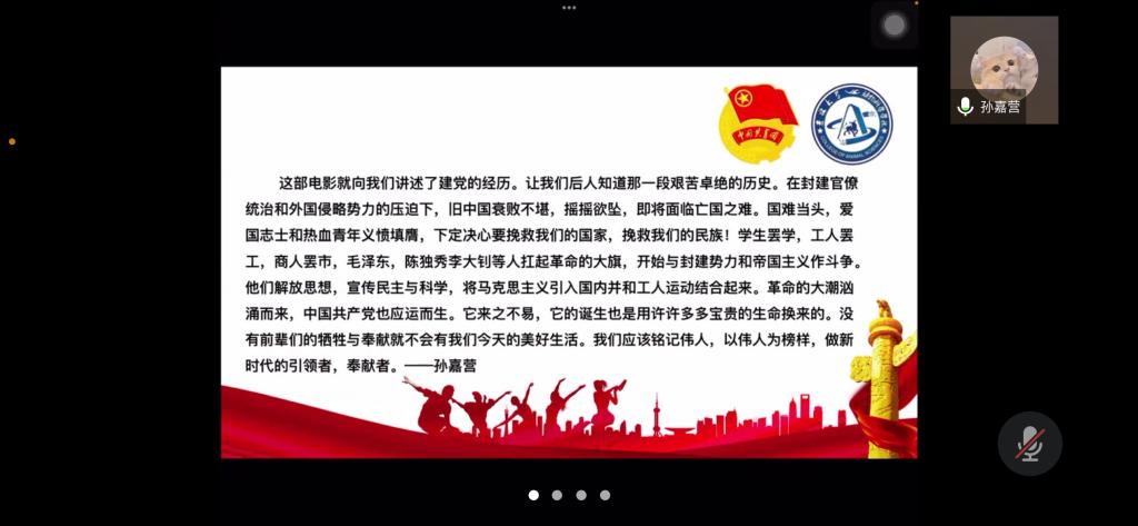为弘扬爱国主义精神,丰富封校隔离期间员工的生活,加强员工团员的思想教育,使同学们正确认识祖国的历史和现实,增强爱国感情和振兴祖国的责任感,公司第七临时团支部举办了爱国主义电影《建党伟业》观影活动,并于2022年4月3日下午14时依托腾讯会议召开“《建党伟业》观后感”线上分享会。活动由临时团支部书记苏廖枷域主持,支部全体成员参加。