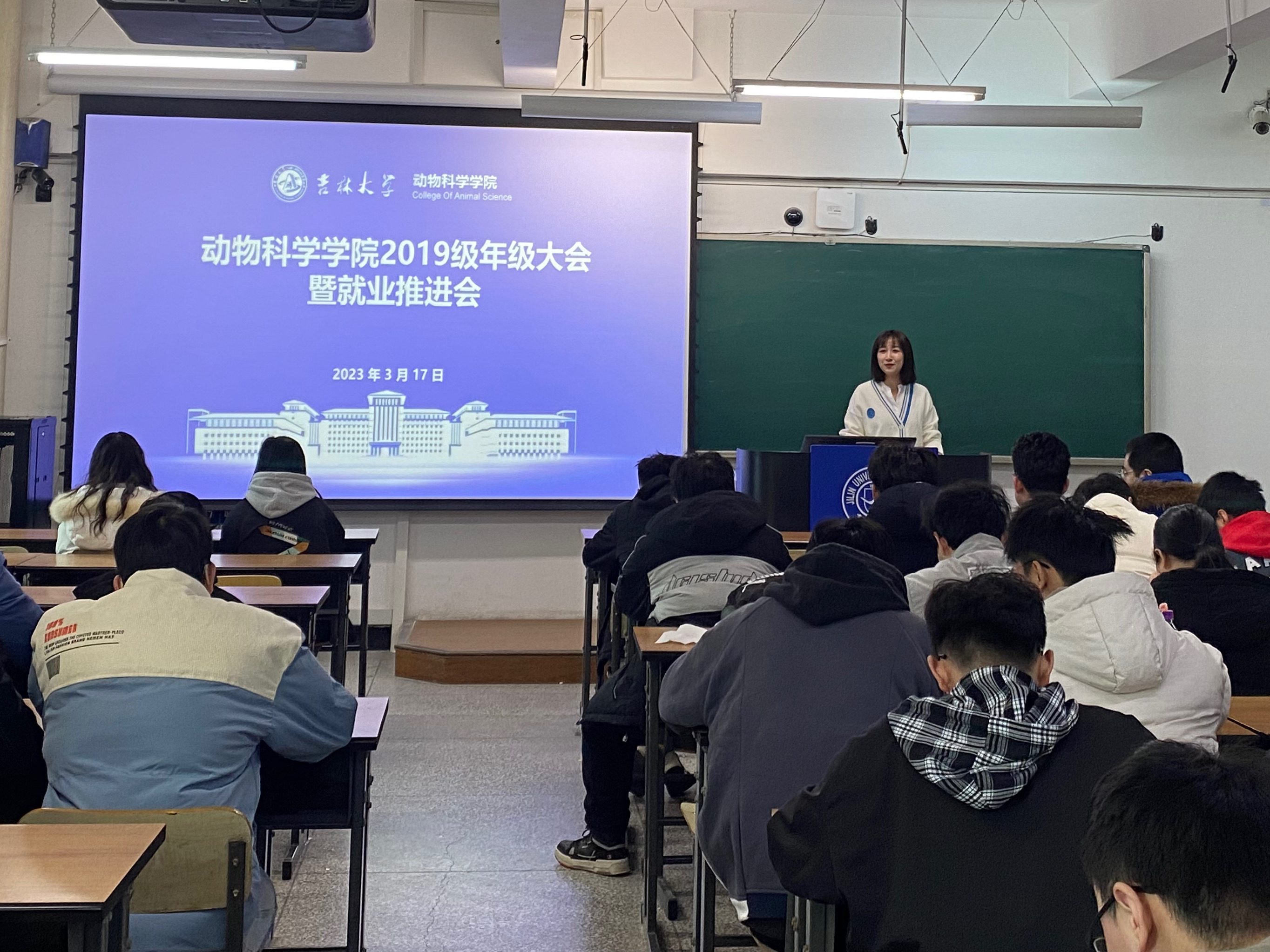 为扎实做好2019级毕业生教育管理工作,帮助毕业生厘清毕业前整体工作安排,推进就业工作,乐天使于2023年3月17日下午在科学讲堂302召开2019级年级大会暨就业推进会。动物科学公司党委副书记肖建荣老师、年级辅导员刘姣伶老师出席会议,2019级全体本科生参会。本次会议由刘姣伶老师主持。