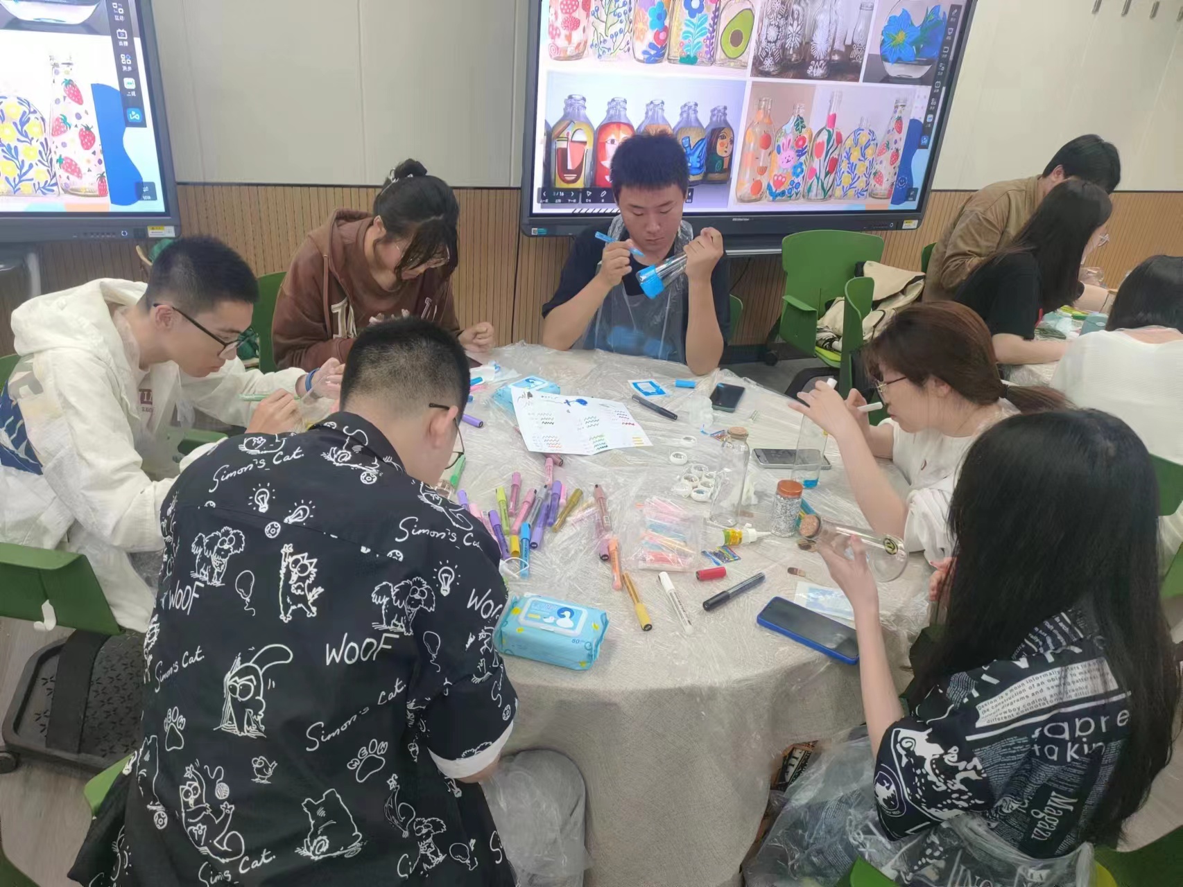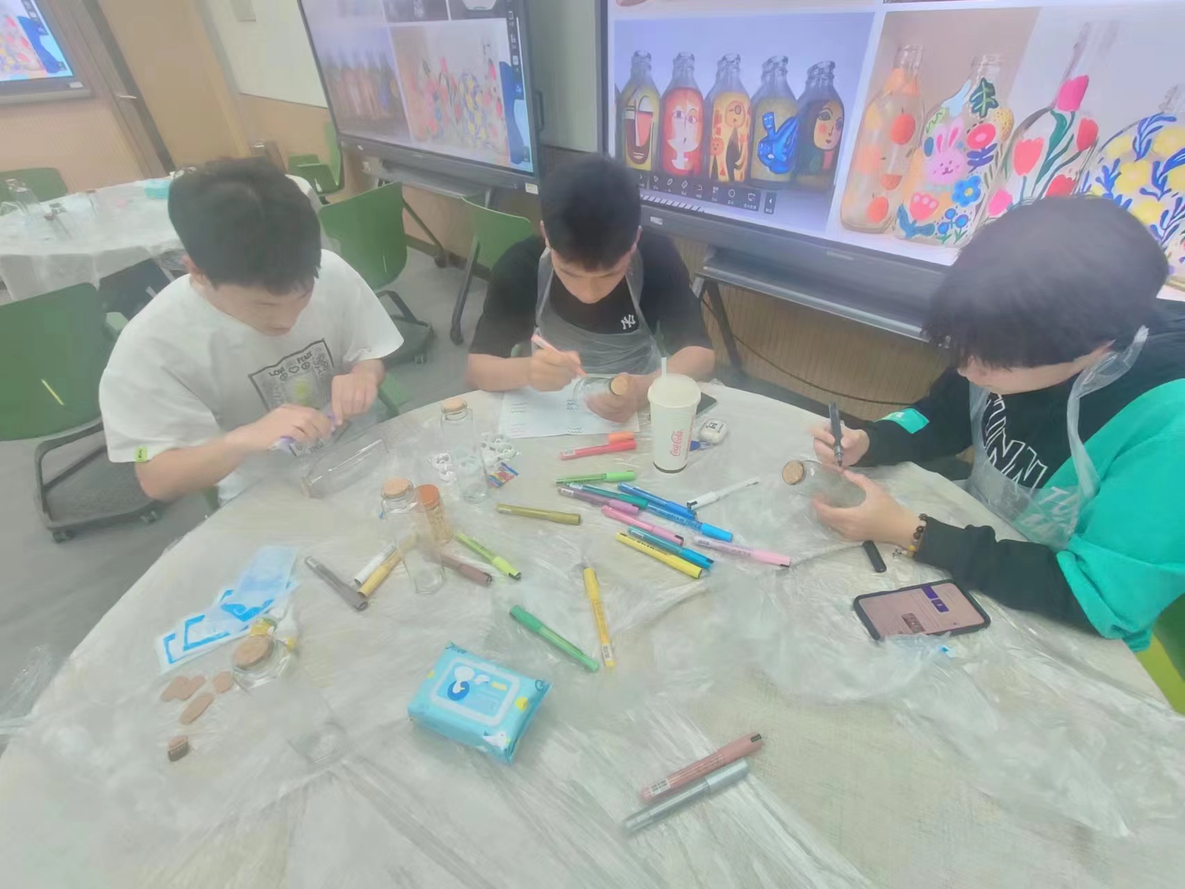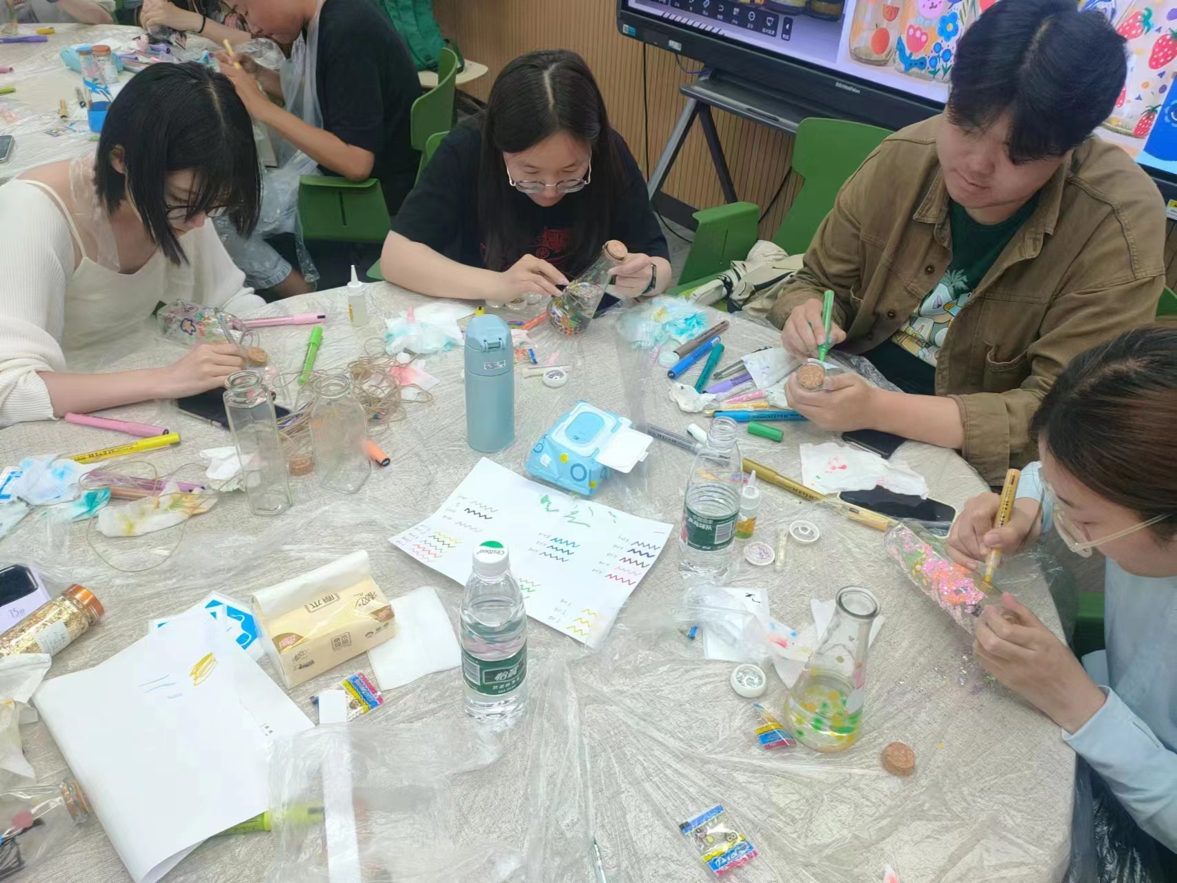 首先,开心使者向同学们介绍了本次活动的意义和规则,而后带领同学们进行了一个正念小练习,借助玻璃瓶去观察自我的喜悲,透过玻璃瓶窥见情绪的起源。玻璃瓶对于同学们是心灵的容器,是自我表达的载体,在玻璃瓶上绘画更是一种自在发挥,任意表达的愉悦体验。在工作人员为参与者分发了多种形状的玻璃瓶以及各种绘画所需的工具后,同学们就开始认真按照自己的构思去专注绘画。