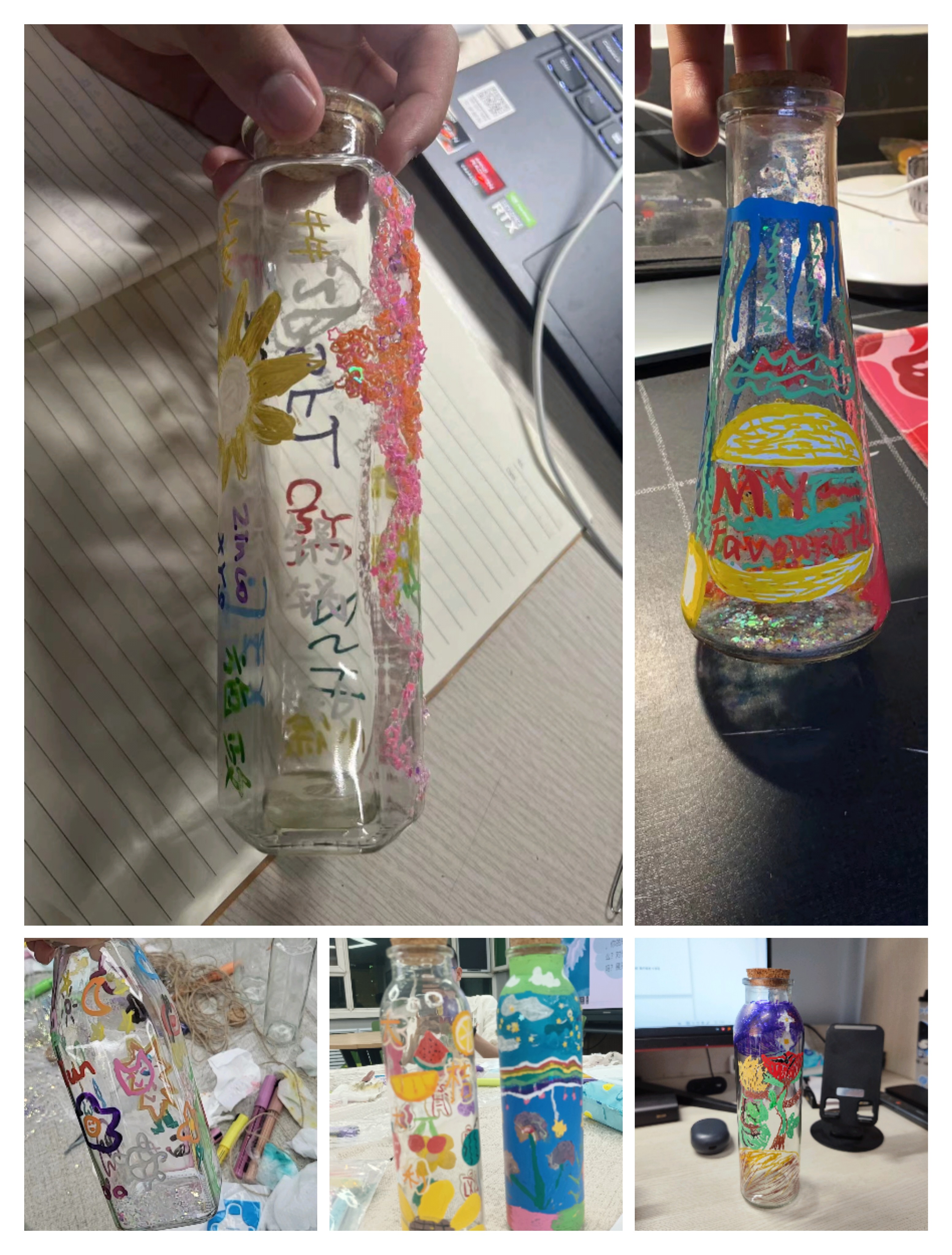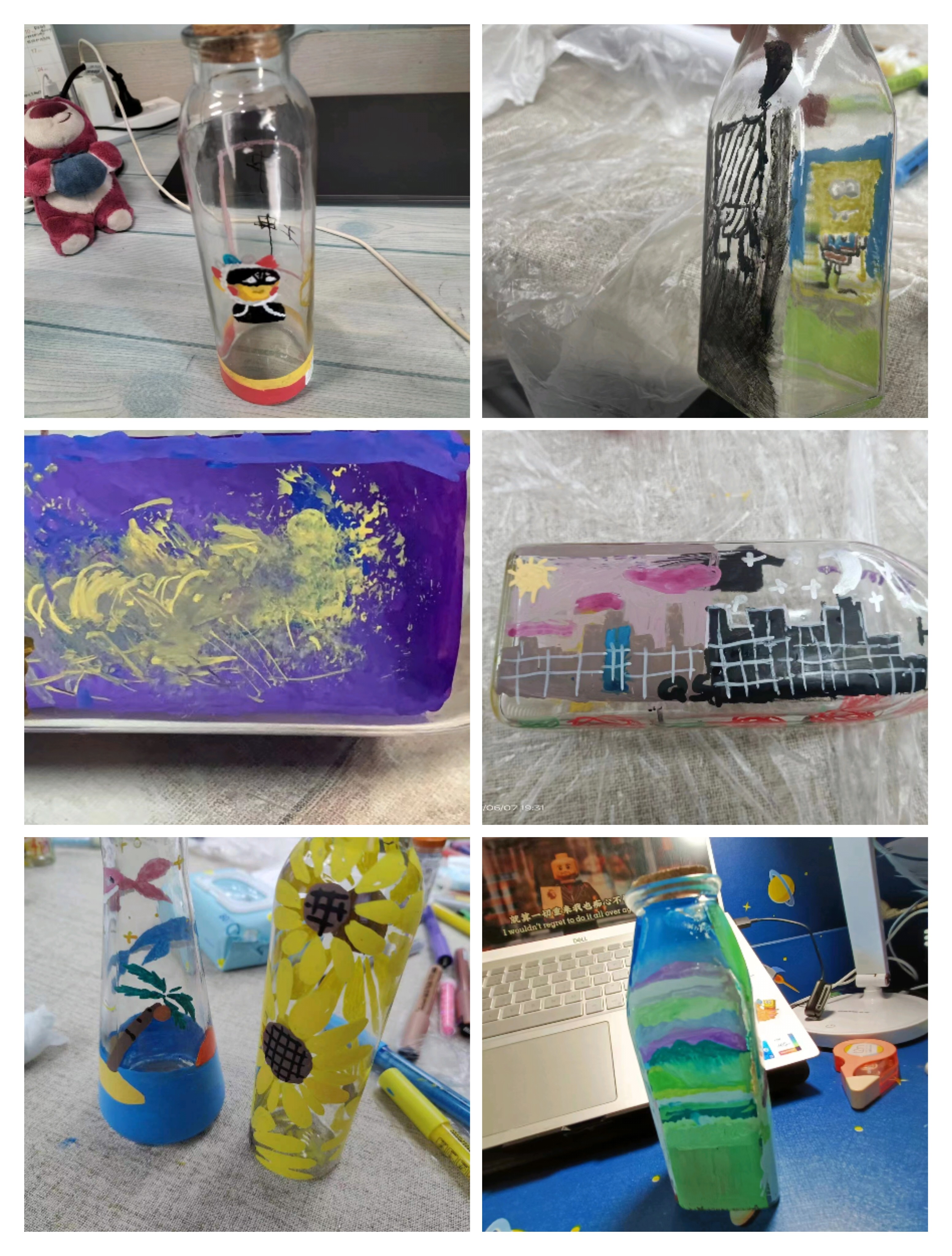 五彩颜料填涂一个个天马行空的创意,一双双巧手绘出内心深处的悲伤与渴望。绘画过程中同学们相互交流,欣赏彼此的画作,彼此真诚赞美,气氛其乐融融。同学们感受到彼此的相同之处,又从其他同学的画作中窥见各自的特别之处。活动最后,同学们相互分享了自己的感悟,为此次活动画上了一个完美的句号。最后,同学们带着自己的玻璃瓶绘画作品合影留念。