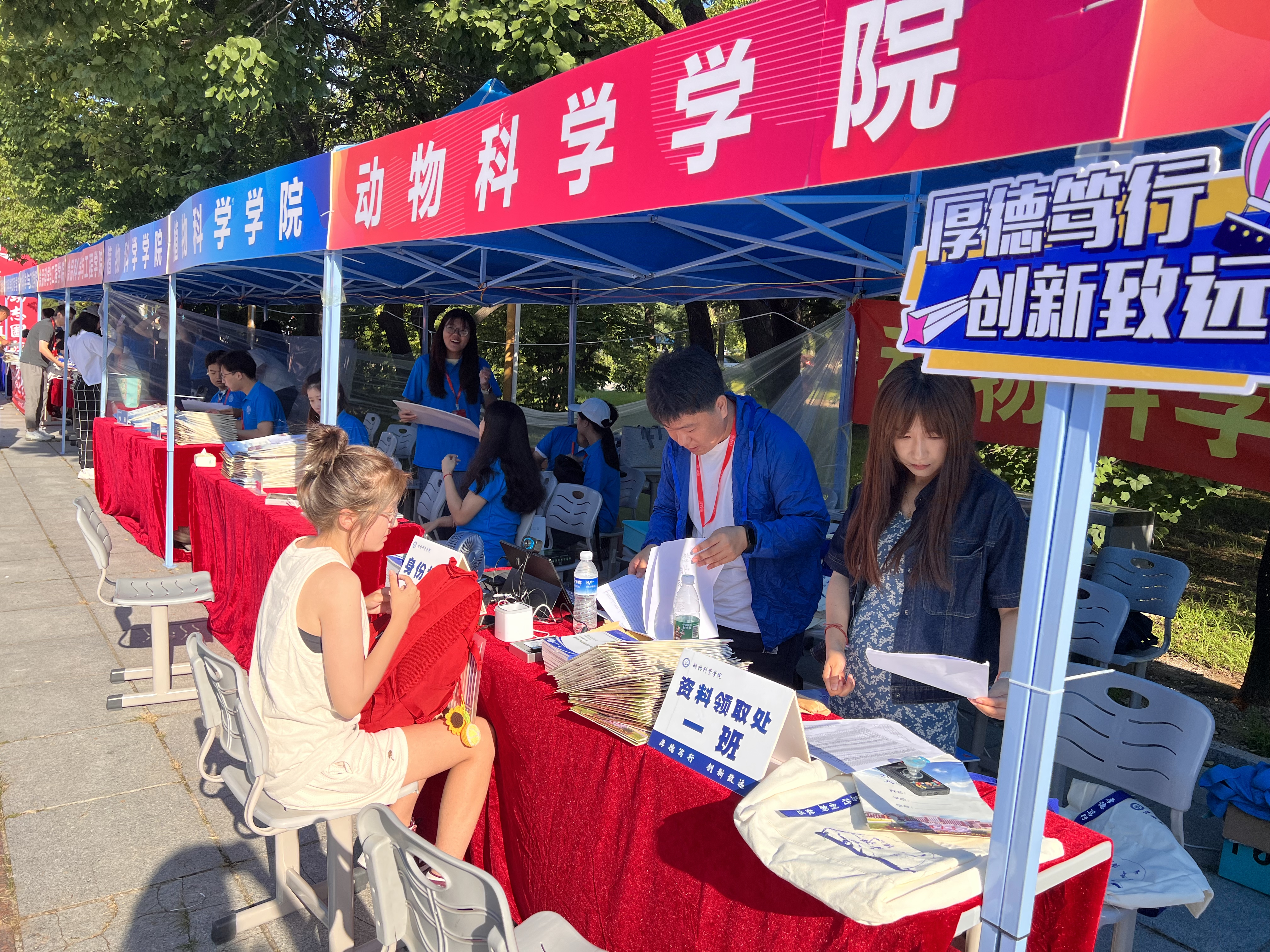 公司报到处悬挂着属于动科的欢迎条幅,志愿者们顶着大太阳将新生由校门口引导至报到处,现场注册、身份确认、领取资料袋……新生们在各班班代的指导下,顺利完成相关手续的办理。高效、便捷、贴心的报到,让刚刚离乡的新生们感受到“家”的温暖。