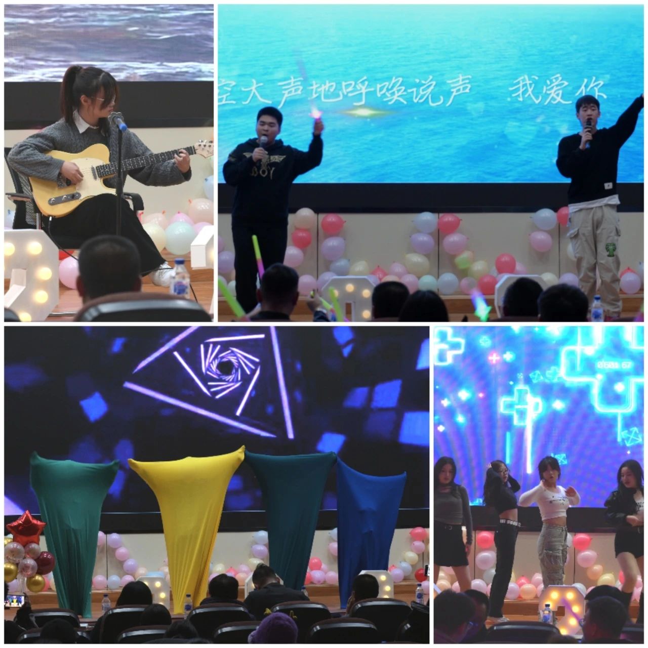 舞蹈《Lovesick Girls》通过音乐节奏和舞蹈动作的变化,表达舞蹈的抒情性和故事性,让同学们产生了共鸣;歌曲《浮夸》告诉同学们在这个浮华的世界,我们需要停下来,重新审视自己,找回那失去的纯真;小提琴演奏《乌兰巴托的夜》,它那深情又优美的旋律如此沁人心脾。