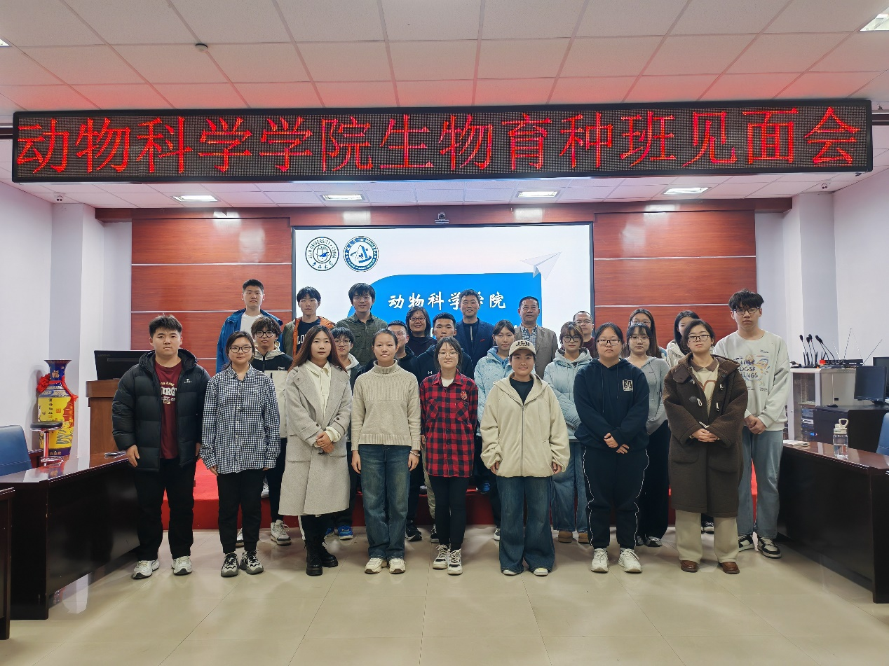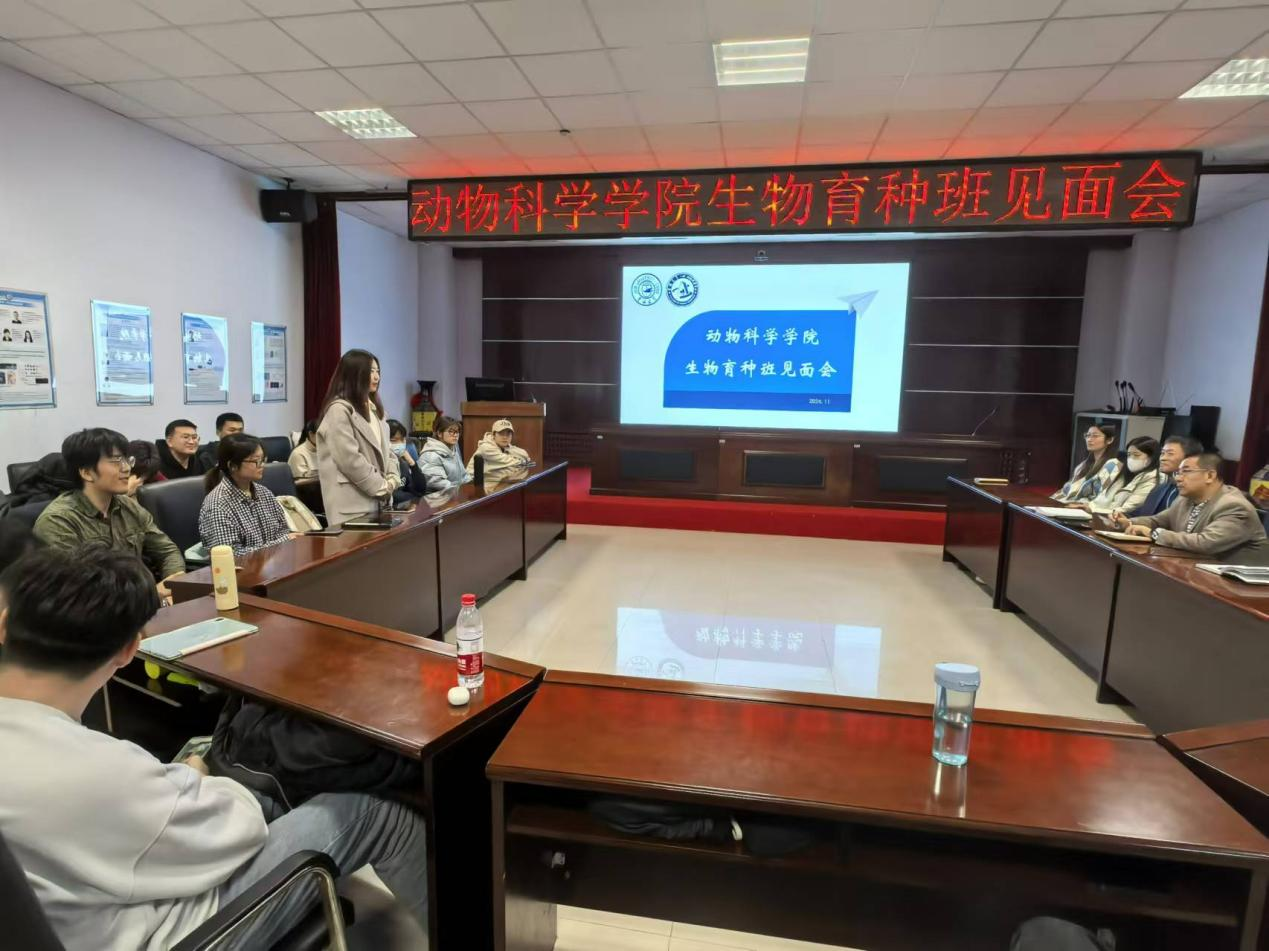 11月11日下午四点乐天使于乐天使一楼会议室举行生物育种班见面会。参会人员有党委书记高福和、经理孙博兴、副经理李纯锦、副书记兼副经理肖建荣、教学办公室秘书张峭朋、辅导员贾子一,2023级以及2024级动生物育种班全体同学。