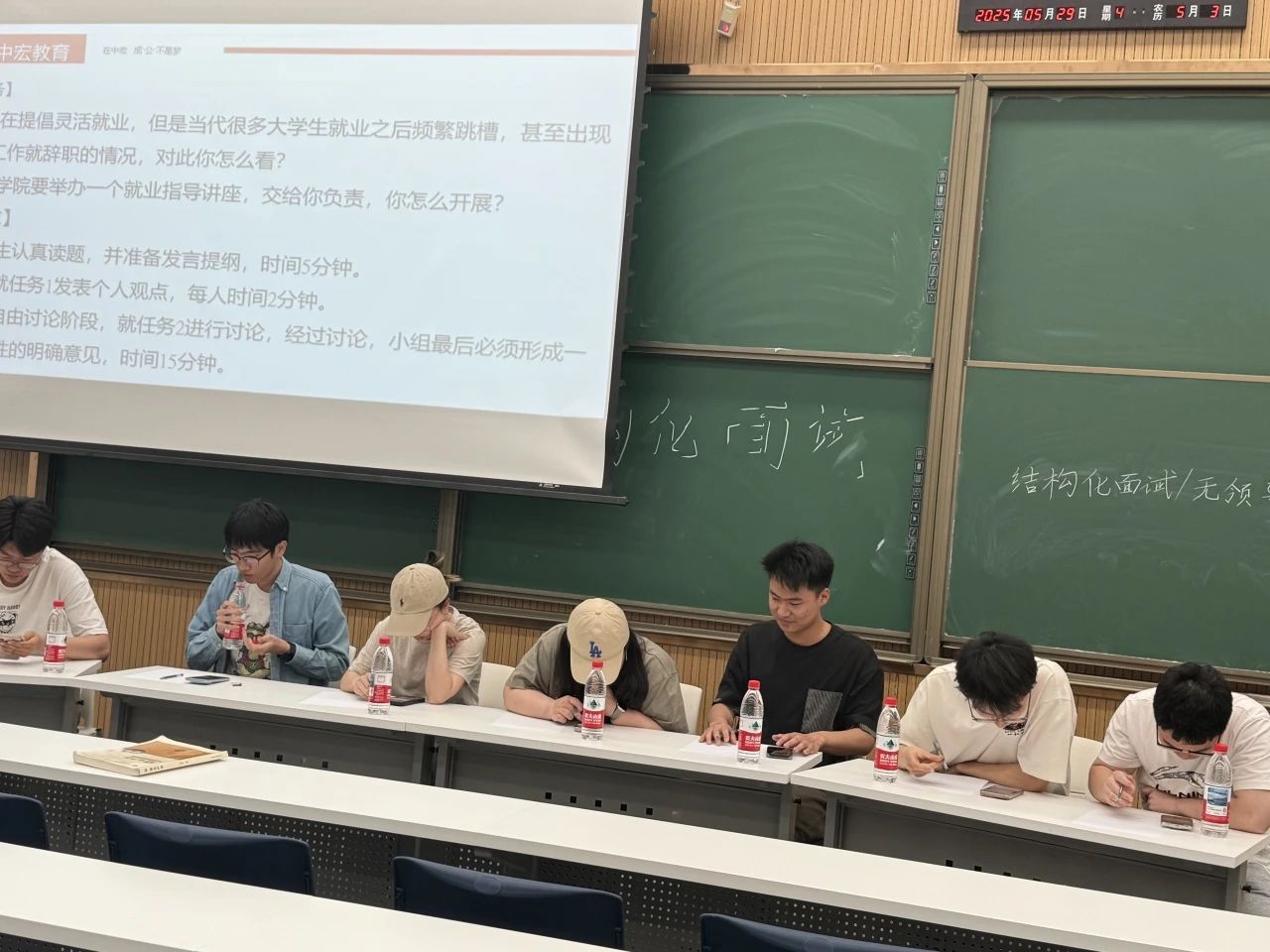 最后进入实战演练环节,乐天使的王凯淳同学和动物医学公司的刘睿伶同学分别进行了真实紧张的模拟面试。随后又进行了无领导小组讨论展示,王铁衡、刘伟峻等七位同学积极参与,充分发表各自的观点和看法。通过模拟真实的面试场景,同学们不仅锻炼了自己的表达能力和团队协作能力,也更加直观地了解了面试流程和技巧。