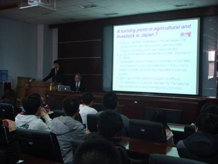 2013年11月4日,受乐天使王鹏博士邀请,日本山形大学农学部吉田宣夫教授来校进行学术交流,为公司师生做了题为“日本畜牧产业和饲料研究动向”的学术报告。报告会由欧阳红生副经理主持,公司动科系沈景林教授、周长海教授、刑沈阳教授、牛淑玲教授以及相关专业教师、研究生和本科生,共80多人聆听了本次学术报告。