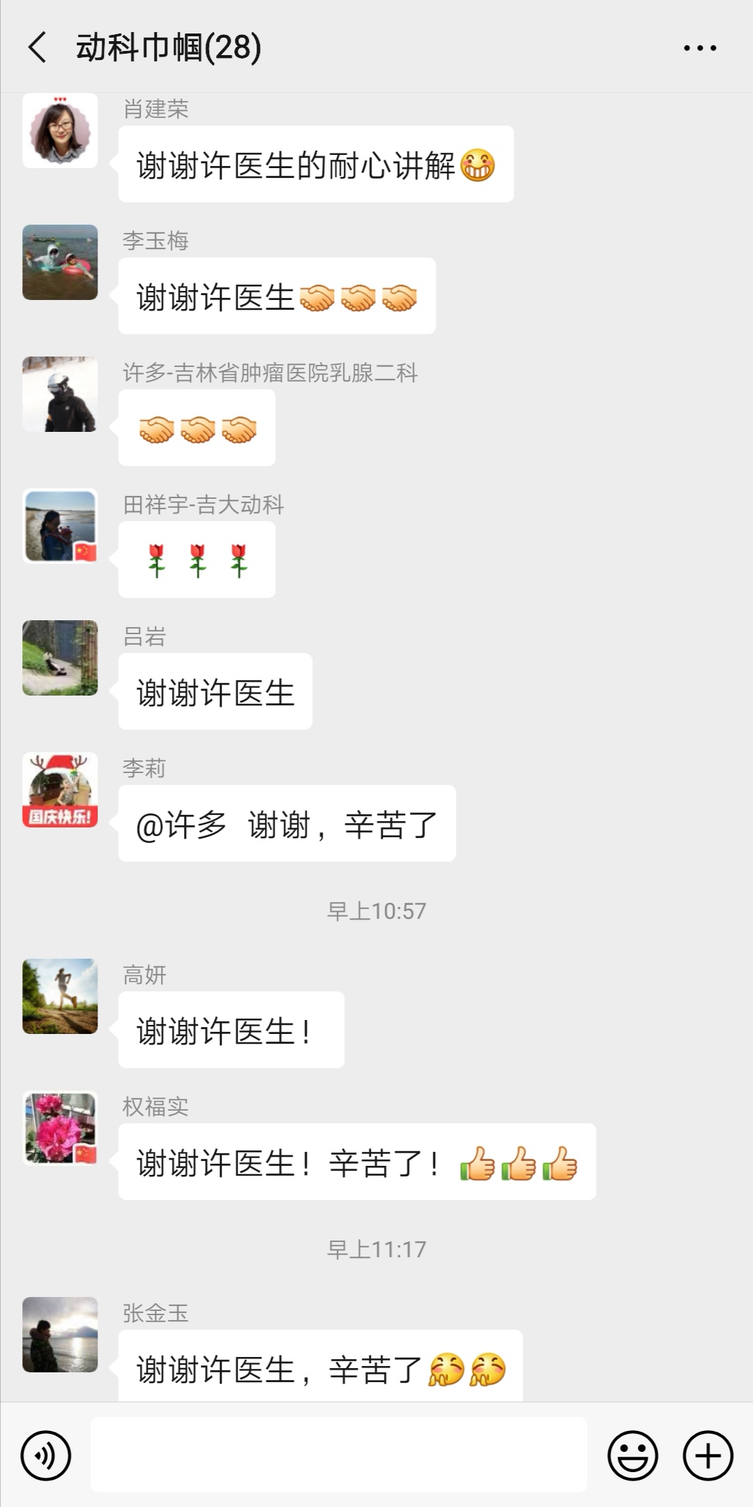 此次健康微课堂活动邀请到了来自吉林省肿瘤医院乳腺二科的许多主治医师,用跨越时空的交流为姐妹们带来了乳腺癌防治的相关话题。微课堂活动受到了女教职工的热烈响应,许多医生的讲解图文并茂,详细生动,在讲座之后,大家纷纷与许医生咨询交流,并收到了耐心详细的解答。