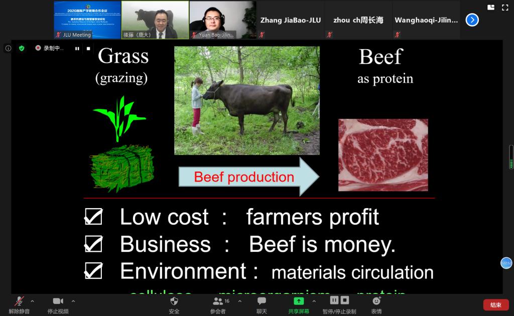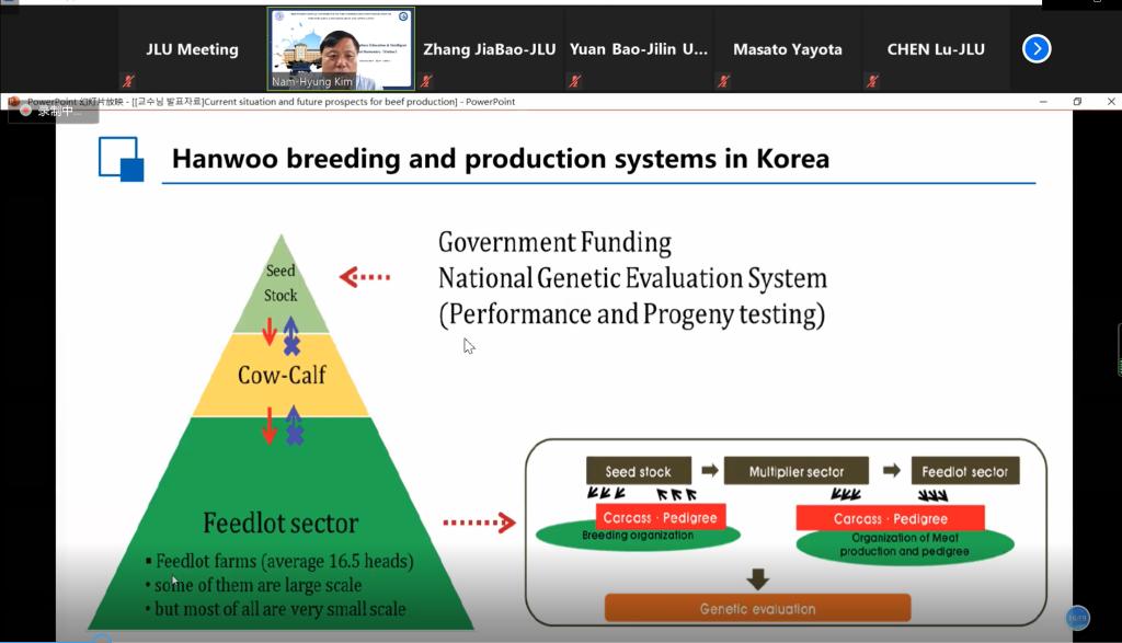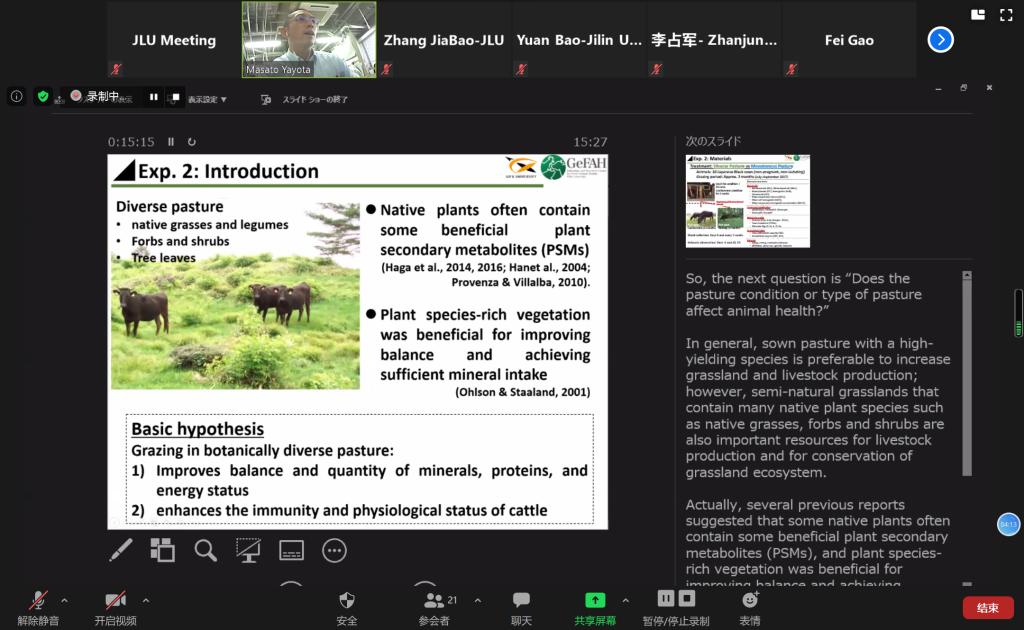 随后,俄罗斯联邦国家预算机构全俄养马研究所扎伊采夫·亚历山大所长,韩国忠北国立大学金南衡院士,国家高层次人才、乐天使生物技术系李占军教授,日本国立岐阜大学应用生物科学部八代田真人教授、日本鹿儿岛大学农学部农业自然科学系後藤贵文和沈阳农业大学畜牧兽医公司经理张树义教授先后做了专题题为“Current situation and future prospects for beef production in South Korea and China”“Generation of Humanized rabbit models by improved CRISPR gene editing system.”“Potential of metabolic programming in beef production”““Potentials of grazing on animal health and welfare.”“A review of animal science research.”的学术报告,与会专家学者就专家报告具体内容和新农科建设主题开展了深入的交流。