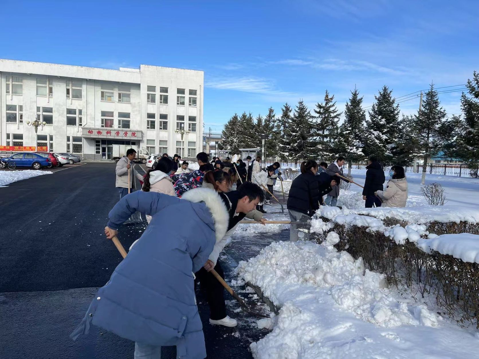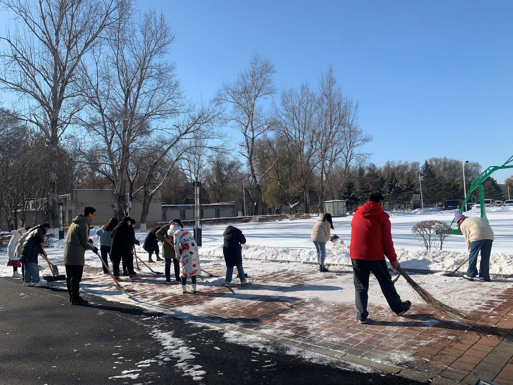 近日,长春市连降大到暴雪。校园里厚厚的积雪给老师和同学们的出行造成了诸多不便。为加强研究生劳动教育和入党积极分子培养考察,减轻后勤部门和环卫工人的清雪压力,2021年11月11日和12日中午,公司研究生党支部组织开展了党史学习教育实践—校园清雪活动。