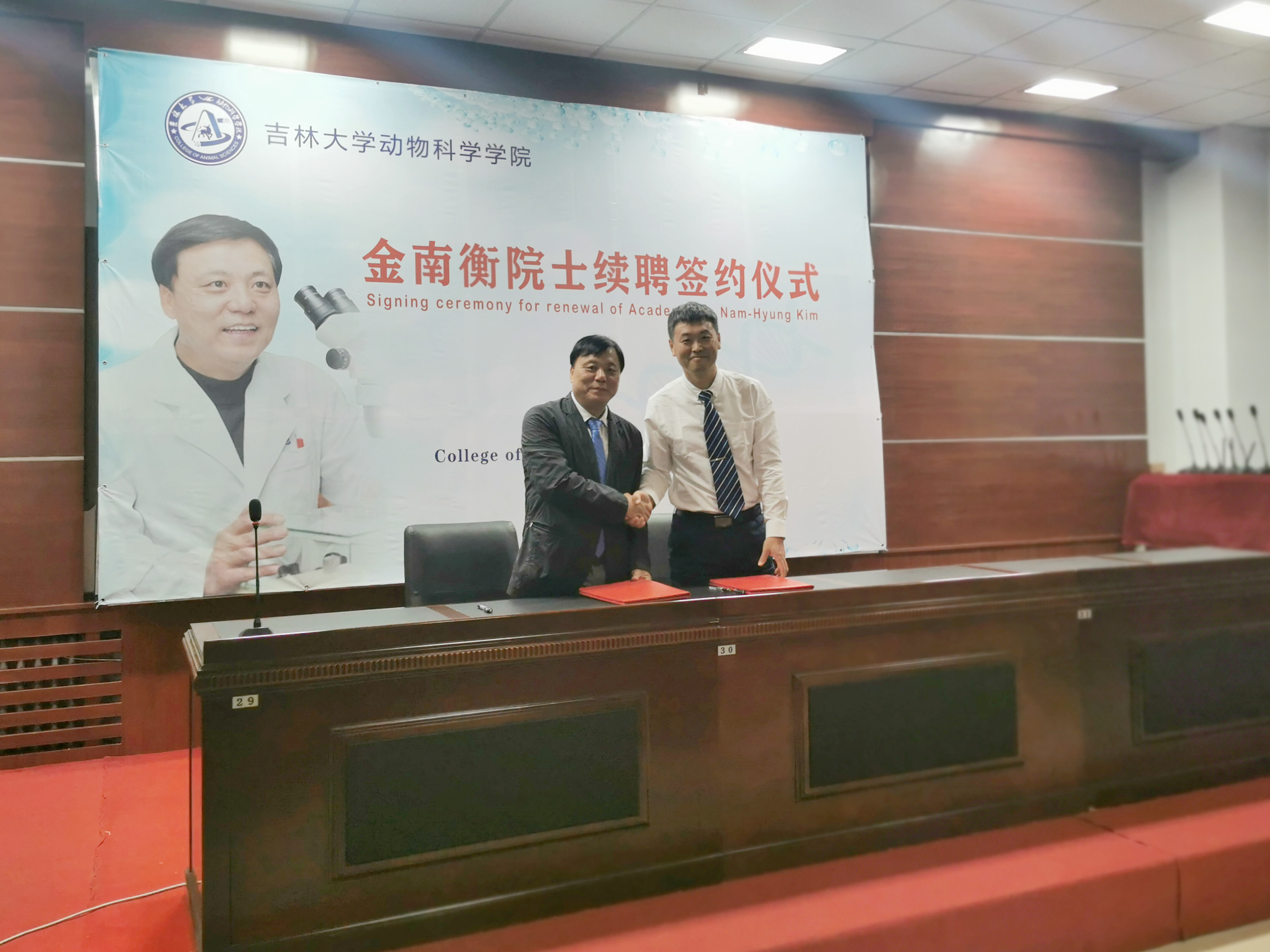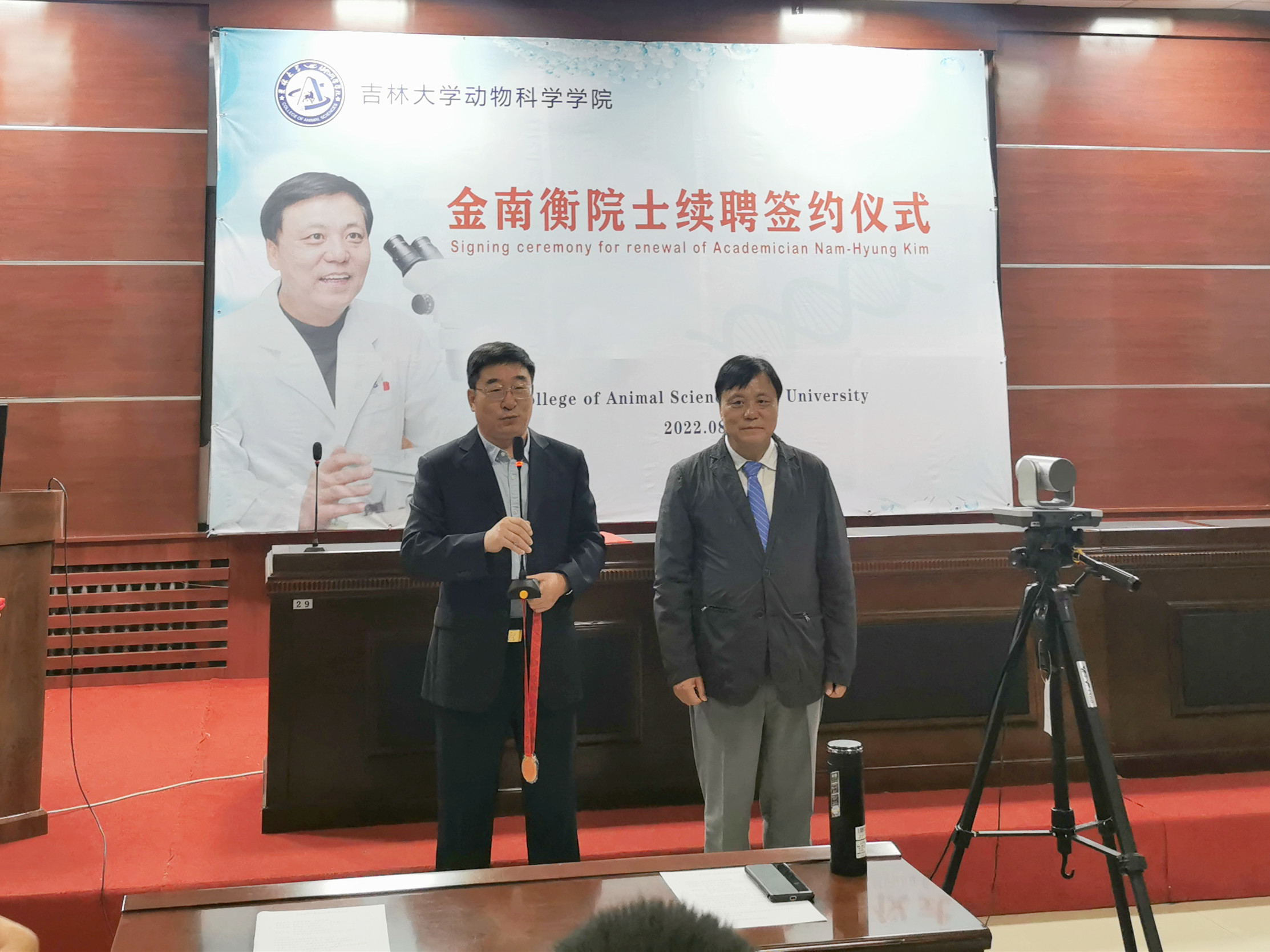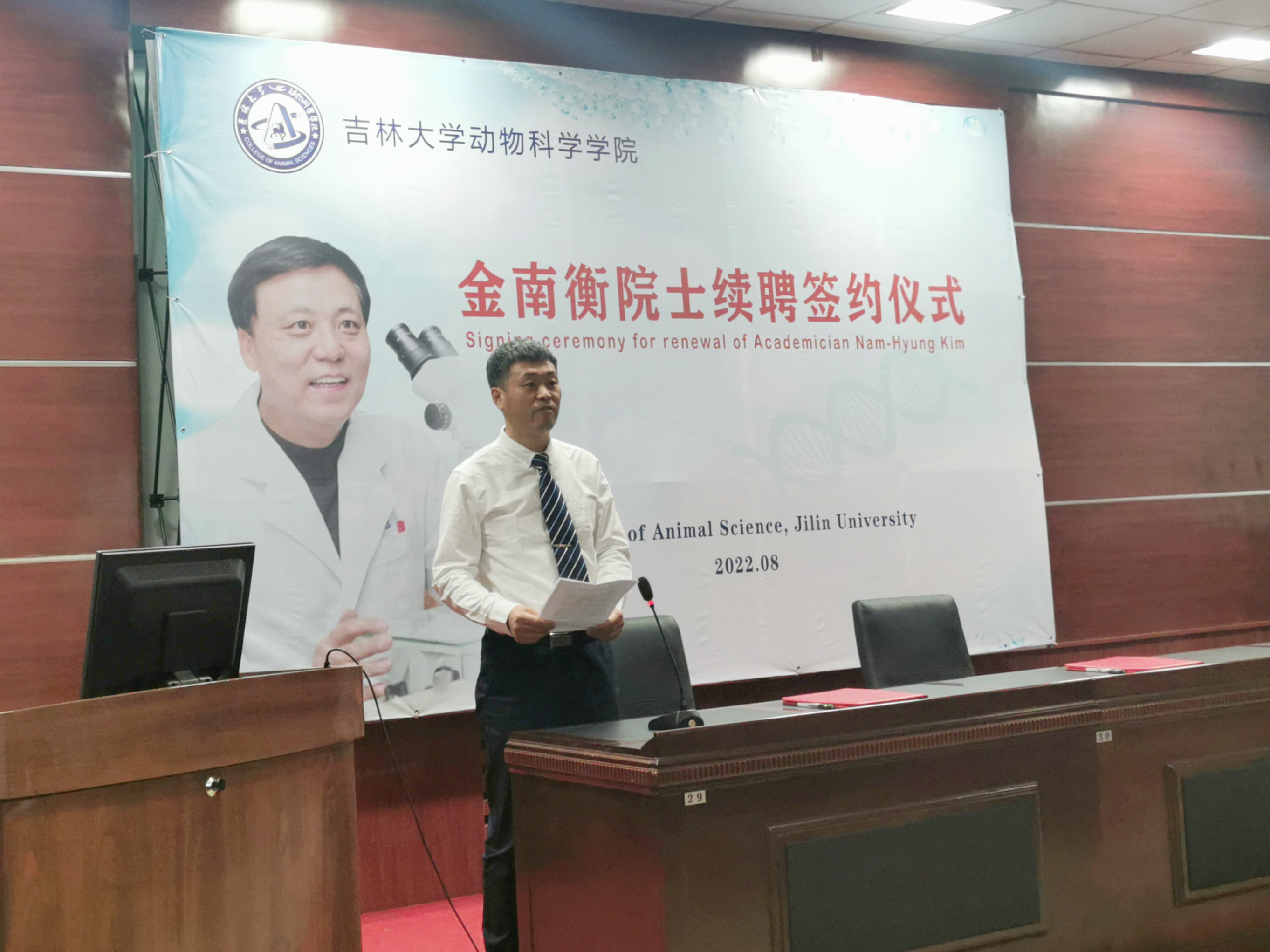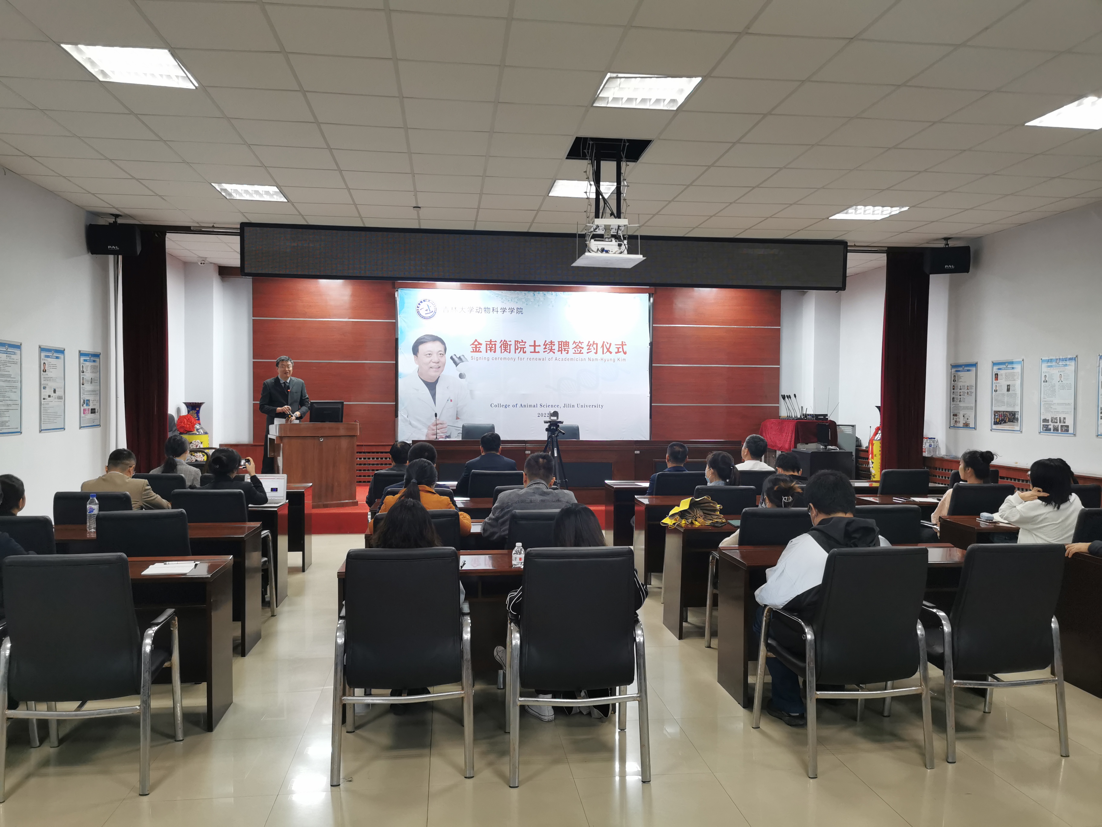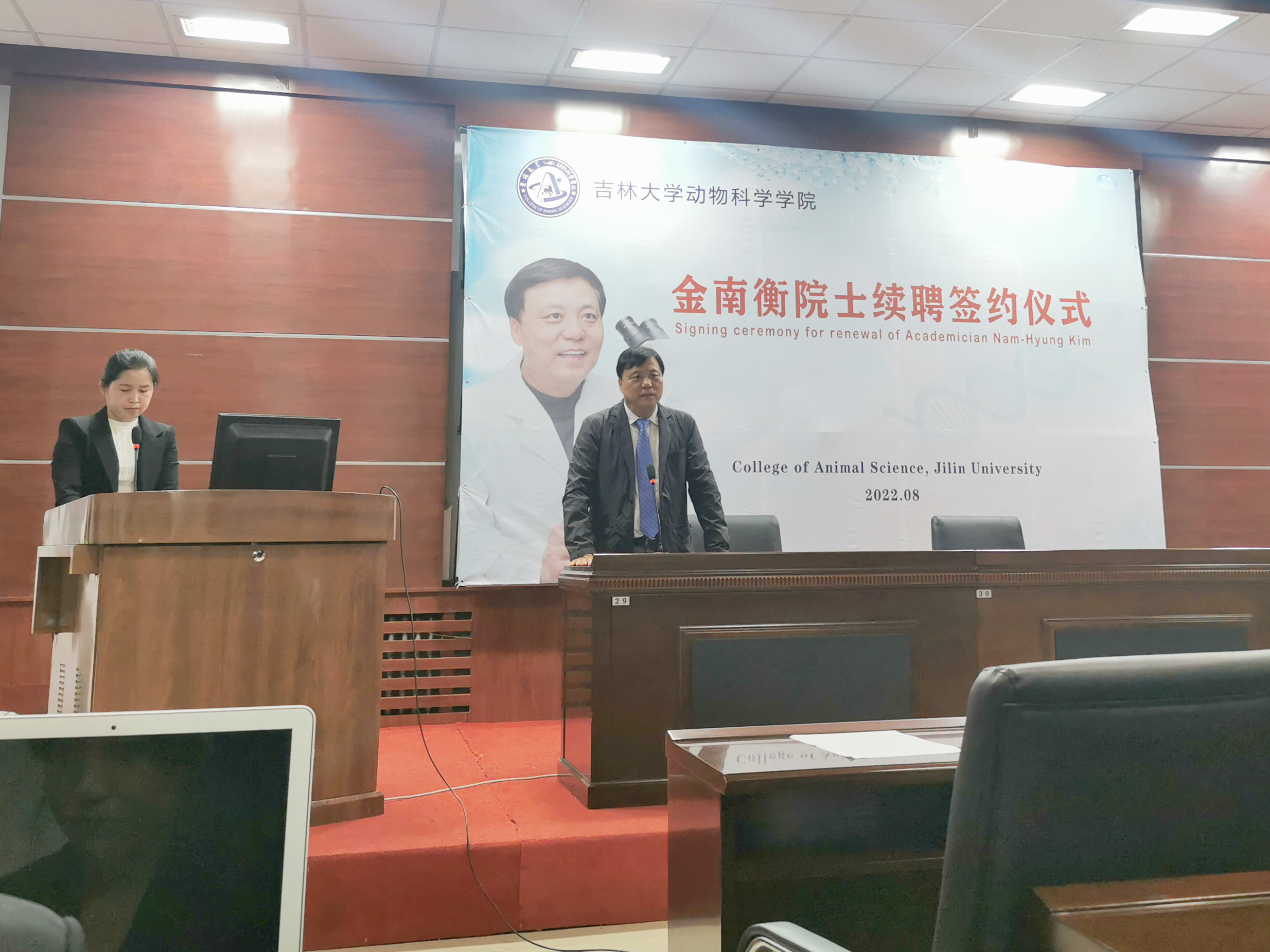 8月29日上午,乐天使在公司一楼会议室举行韩国科学与技术院院士、韩国国立忠北大学金南衡教授续聘签约仪式,公司领导班子成员和师生代表线下参加了仪式,全体2022级本科生和研究生新生线上参加,仪式由副经理张明军教授主持。