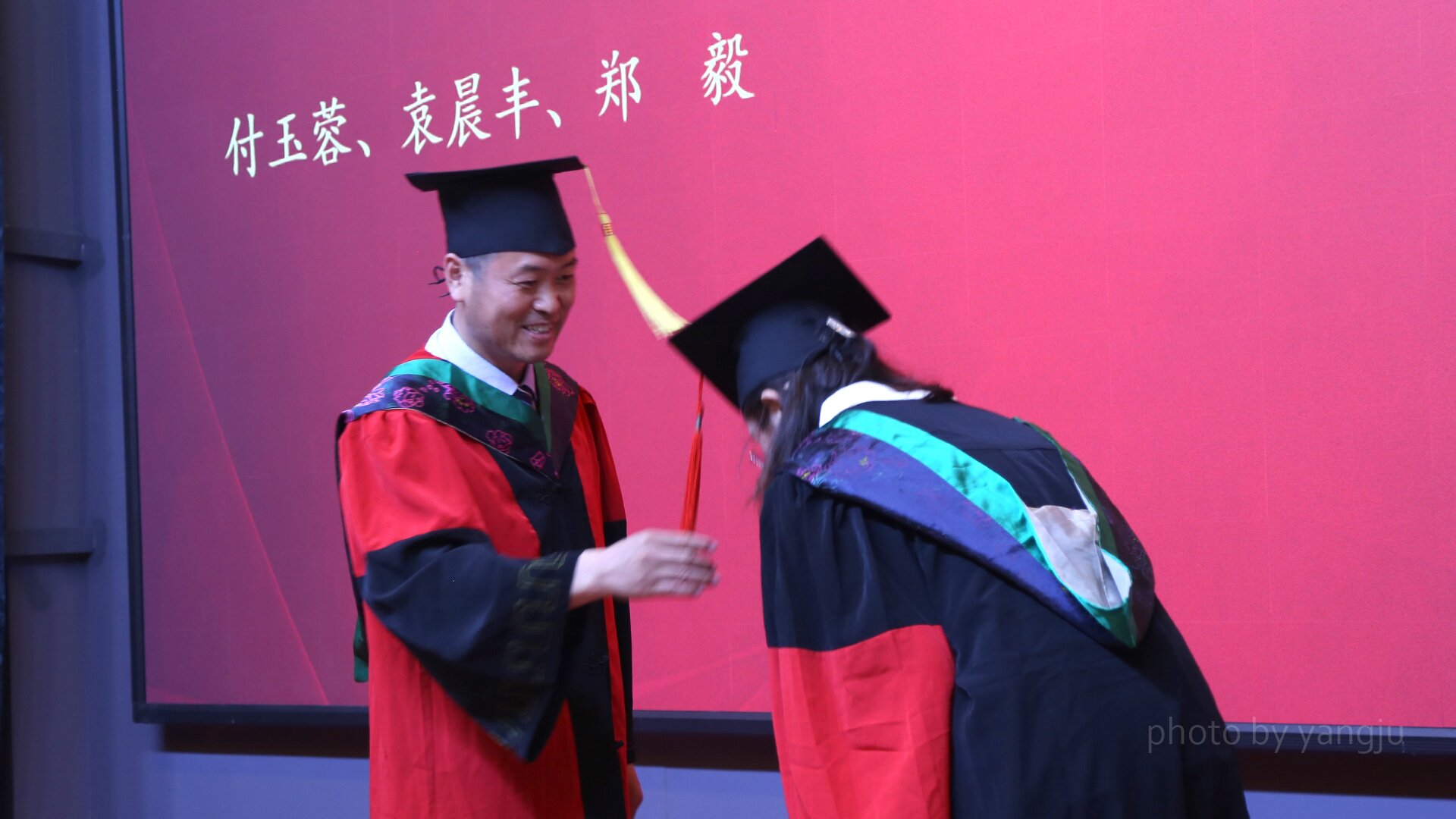 学科学位评定分委会主席张明军教授宣读《关于授予2023届博士学位、硕士学位和学士学位的决定》。经理孙博兴教授,动物科学系周虚教授、沈景林教授,实验动物系任文陟教授,生物技术系李占军教授主礼全体毕业生学位授予。