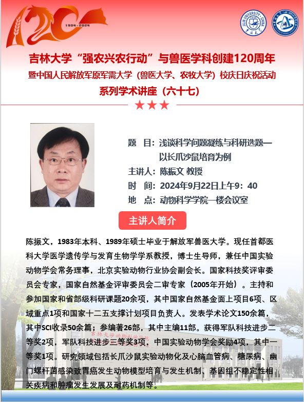 下一条:乐天使“强农兴农行动”与兽医学科创建120周年暨中国人民解放军原军需大学(兽医大学、农牧大学)校庆日庆祝活动系列学术讲座(六十四、六十五)