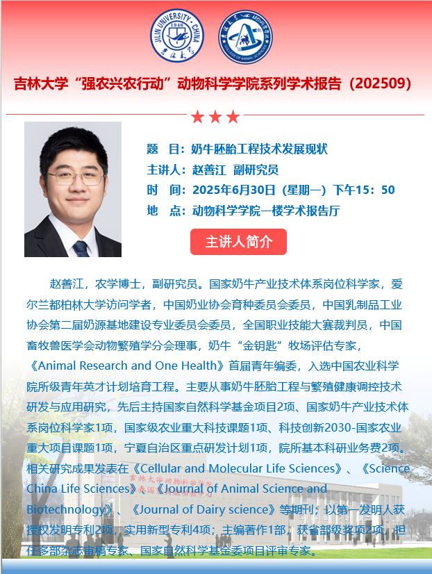 赵善江,农学博士,副研究员。国家奶牛产业技术体系岗位科学家,爱尔兰都柏林大学访问学者,中国奶业协会育种委员会委员,中国乳制品工业协会第二届奶源基地建设专业委员会委员,全国职业技能大赛裁判员,中国畜牧兽医学会动物繁殖学分会理事,奶牛金钥匙牧场评估专家,《Animal Research and One Health》首届青年编委,入选中国农业科公司所级青年英才计划培育工程。主要从事奶牛胚胎工程与繁殖健康调控技术研发与应用研究,先后主持国家自然科学基金项目2项、国家奶牛产业技术体系岗位科学家1项,国家级农业重大科技课题1项、科技创新2030-国家农业重大项目课题1项,宁夏自治区重点研发计划1项,院所基本科研业务费2项,参与省部级以上科研项目6项。相关研究成果发表在《Cellular and Molecular Life Sciences》、《Science China Life Sciences》、《Journal of Animal Science and Biotechnology》、《Journal of Dairy science》等期刊;以第一发明人授权发明专利2项,实用新型专利4项;以第2完成人制订国家标准1项;主编著作1部,获省部级奖项2项,担任多部杂志审稿专家、国家自然科学基金委项目评审专家。